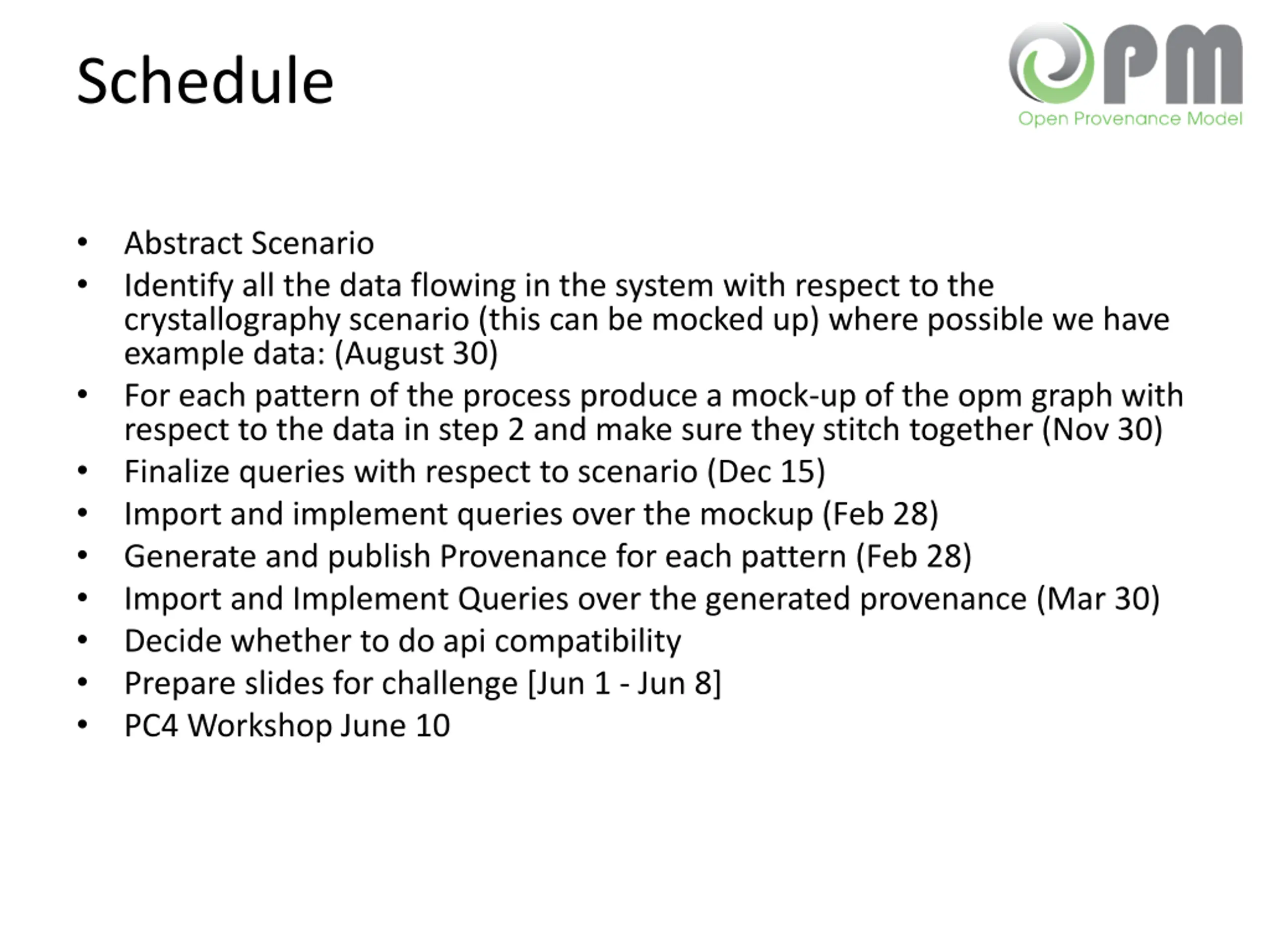 Schedule Abstract Scenario Identify all the data flowing in the system with respect to the crystallography scenario (this can be mocked up) where possible we have example data: (August 30) For each pattern of the process produce a mock-up of the opm graph with respect to the data in step 2 and make sure they stitch together (Nov 30) Finalize queries with respect to scenario (Dec 15) Import and implement queries over the mockup (Feb 28) Generate and publish Provenance for each pattern (Feb 28) Import and Implement Queries over the generated provenance (Mar 30) Decide whether to do api compatibility Prepare slides for challenge [Jun 1 - Jun 8] PC4 Workshop June 10
