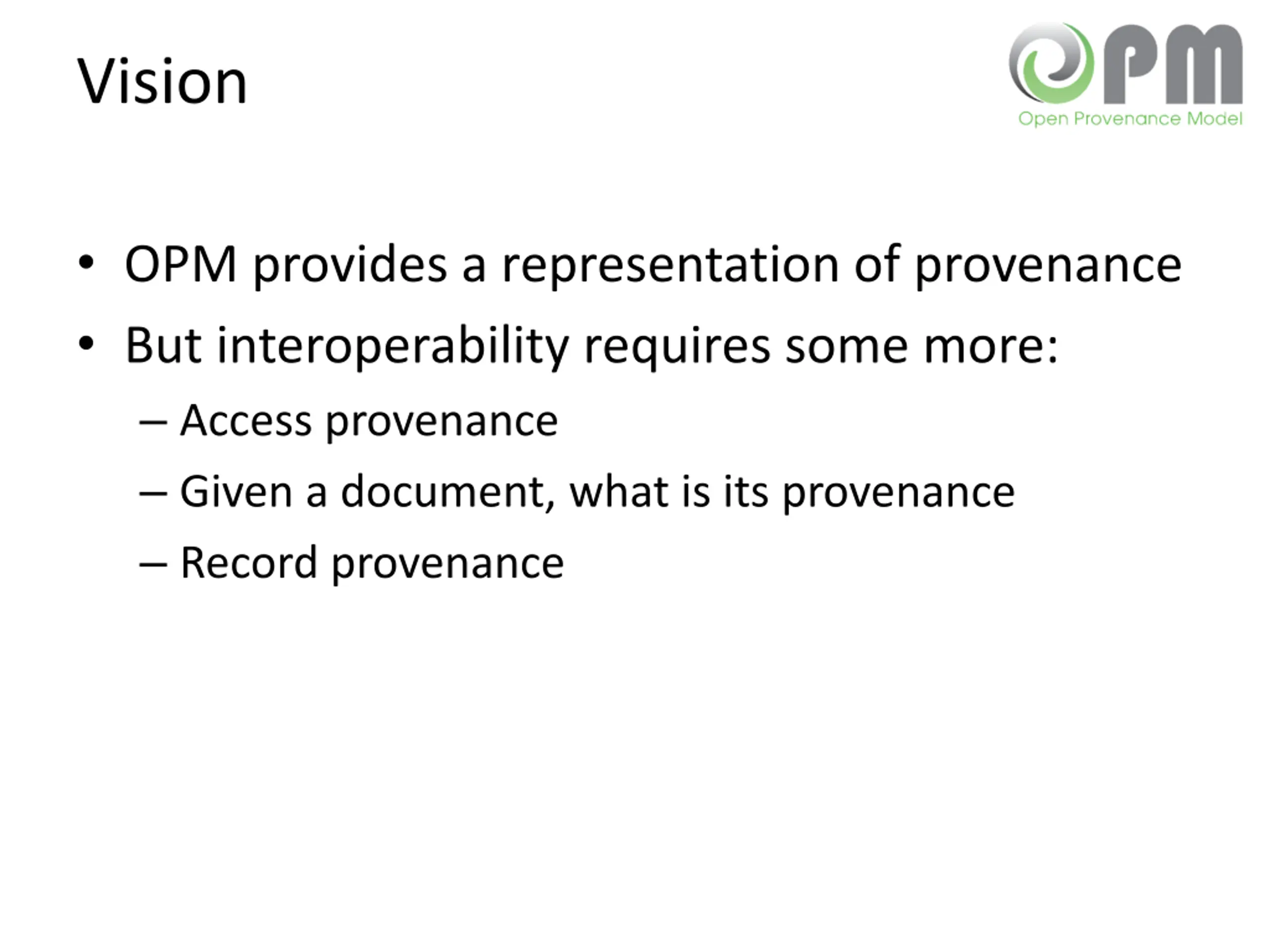 Vision OPM provides a representation of provenance But interoperability requires some more: Access provenance Given a document, what is its provenance Record provenance
