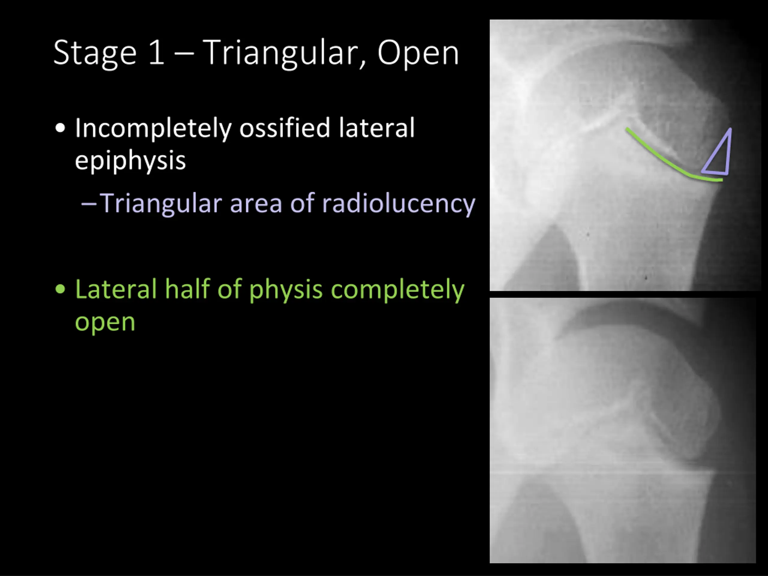 Stage 1 Triangular, Open Incompletely ossified lateral epiphysis Triangular area of radiolucency Lateral half of physis completely open