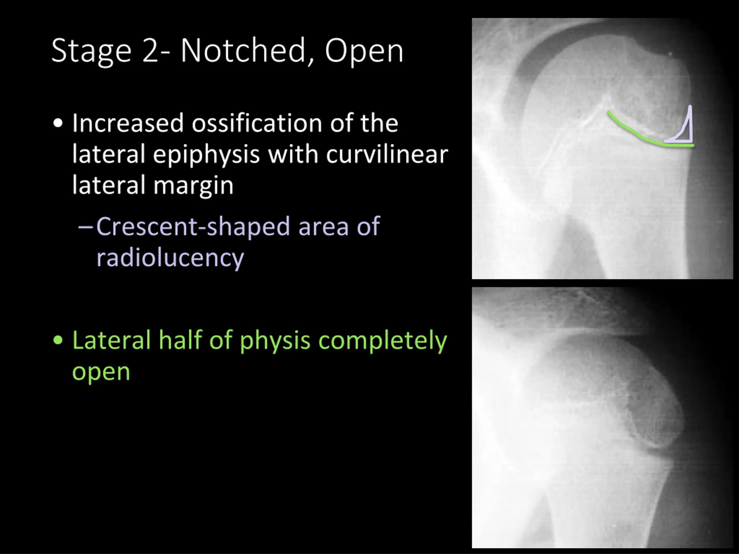 Stage 2- Notched, Open Increased ossification of the lateral epiphysis with curvilinear lateral margin Crescent-shaped area of radiolucency Lateral half of physis completely open