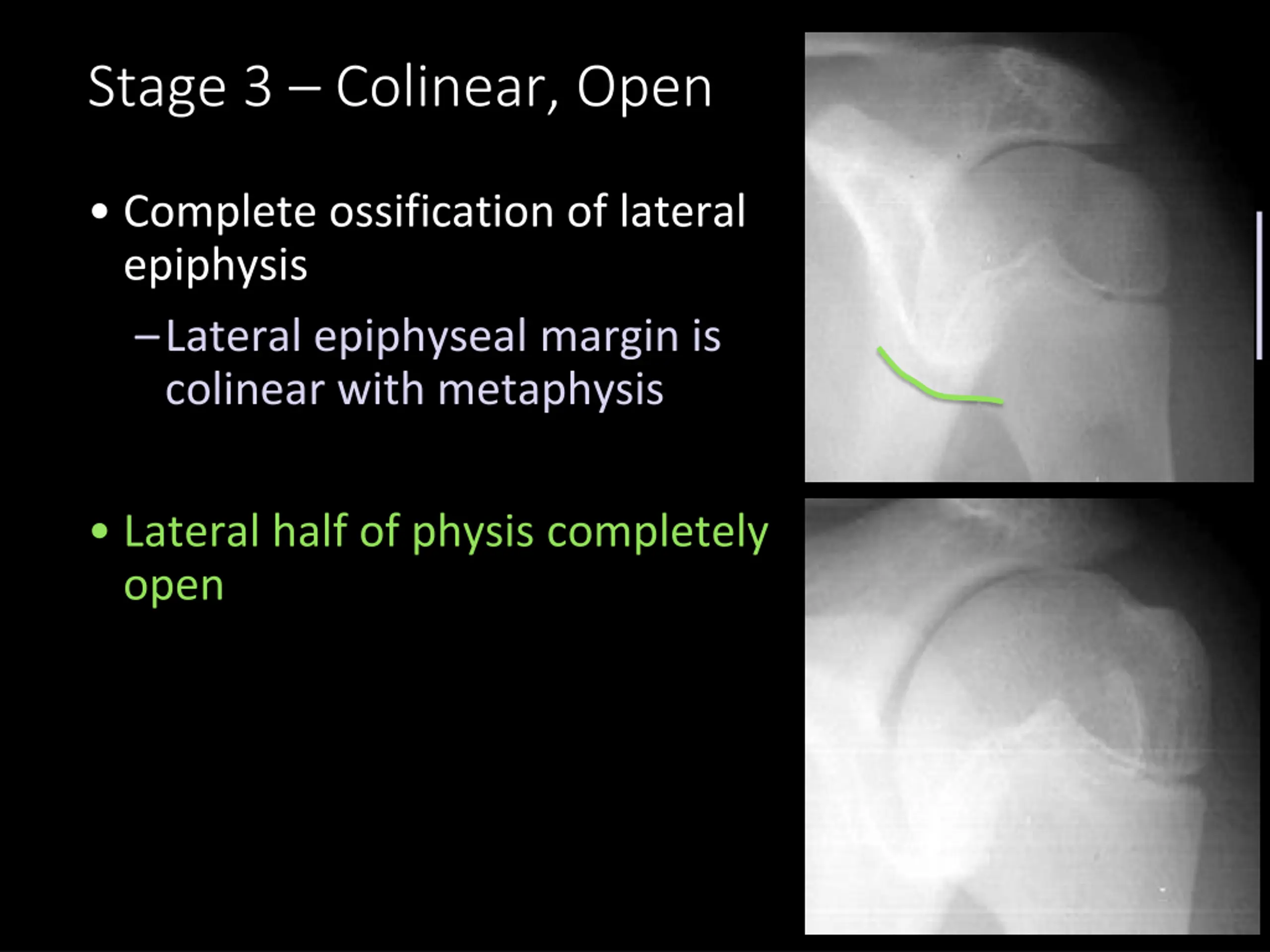 Stage 3 Colinear, Open Complete ossification of lateral epiphysis Lateral epiphyseal margin is colinear with metaphysis Lateral half of physis completely open