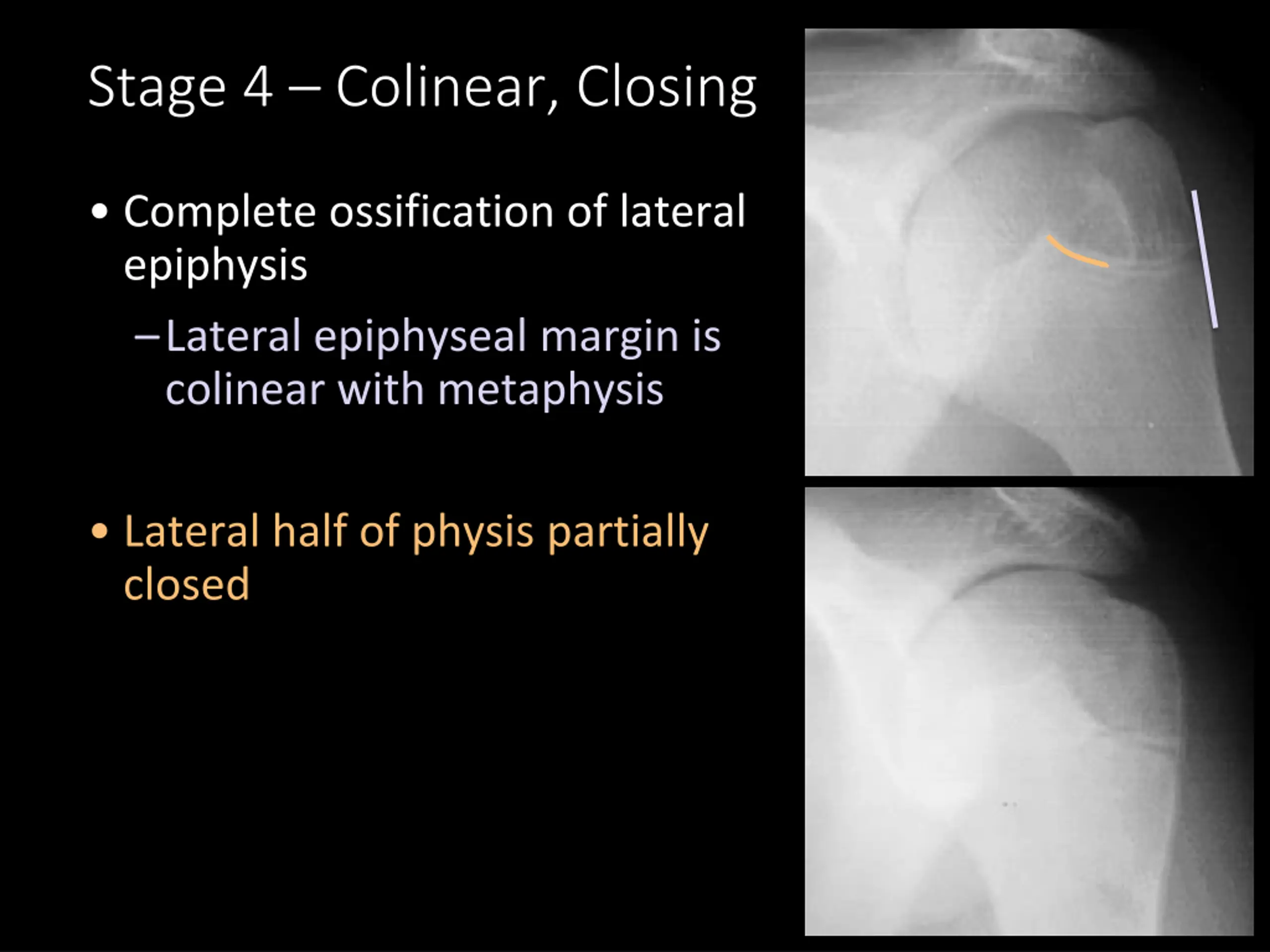 Stage 4 Colinear, Closing Complete ossification of lateral epiphysis Lateral epiphyseal margin is colinear with metaphysis Lateral half of physis partially closed
