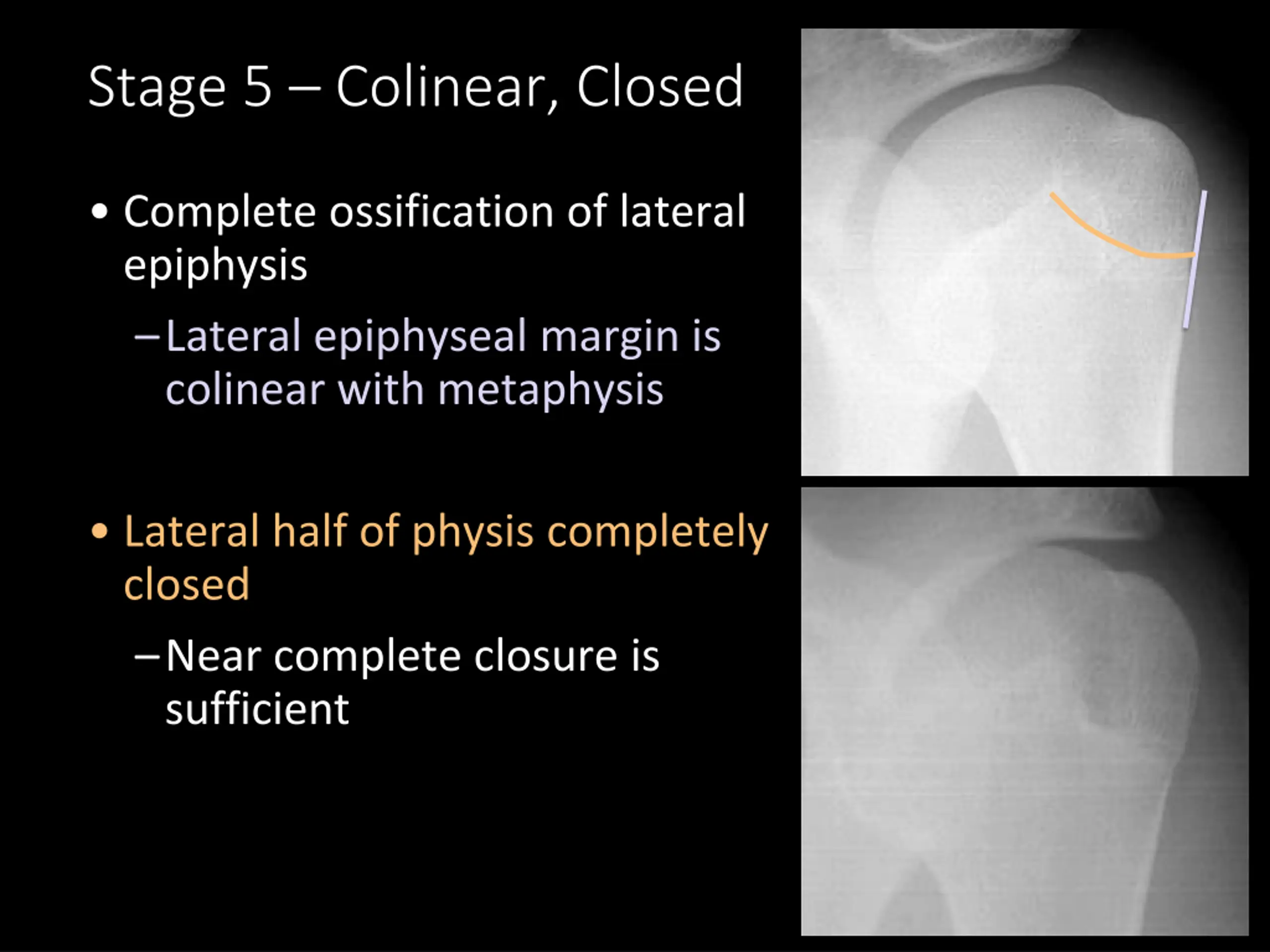Stage 5 Colinear, Closed Complete ossification of lateral epiphysis Lateral epiphyseal margin is colinear with metaphysis Lateral half of physis completely closed Near complete closure is sufficient