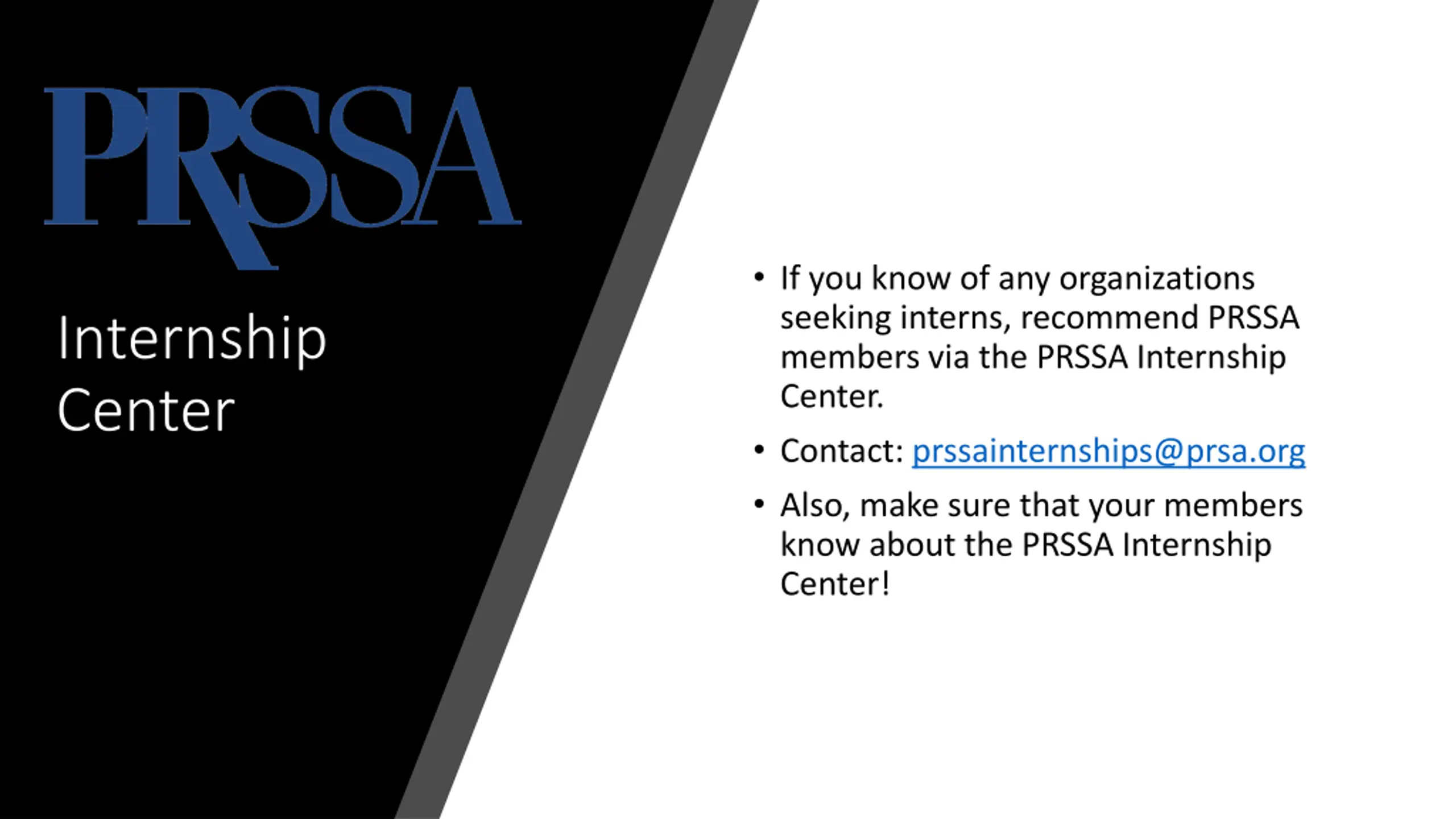If you know of any organizations seeking interns, recommend PRSSA members via the PRSSA Internship Center. Contact: prssainternships@prsa.org Also, make sure that your members know about the PRSSA Internship Center! Internship Center prssainternships@prsa.org