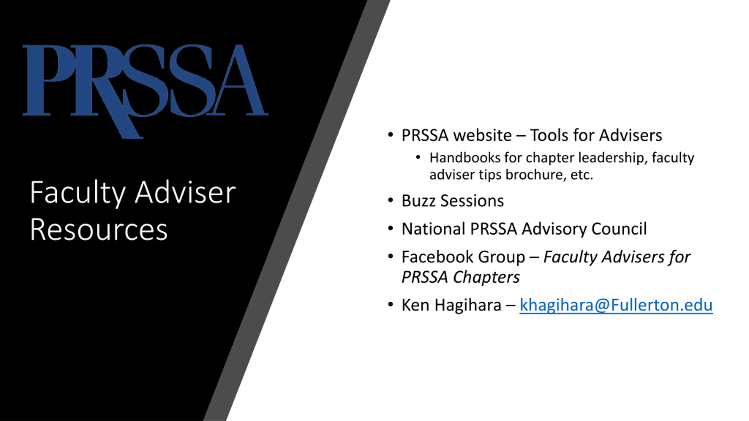 PRSSA website Tools for Advisers Handbooks for chapter leadership, faculty adviser tips brochure, etc. Buzz Sessions National PRSSA Advisory Council Facebook Group Faculty Advisers for PRSSA Chapters Ken Hagihara khagihara@Fullerton.edu Faculty Adviser Resources khagihara@Fullerton.edu