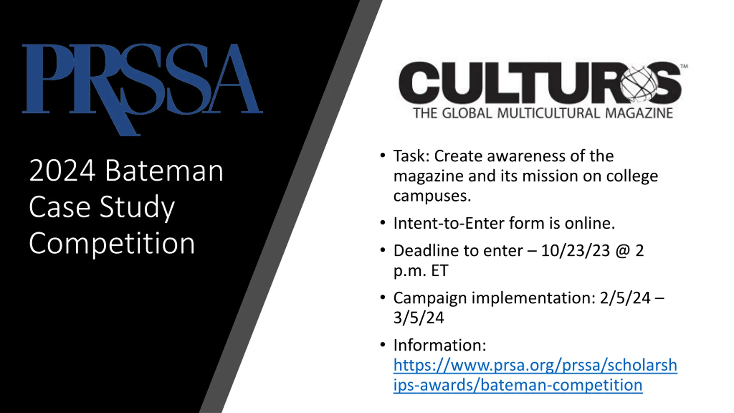 Task: Create awareness of the magazine and its mission on college campuses. Intent-to-Enter form is online. Deadline to enter 10/23/23 @ 2 p.m. ET Campaign implementation: 2/5/24 3/5/24 Information: 2024 Bateman Case Study Competition https://www.prsa.org/prssa/scholarships-awards/bateman-competition https://www.prsa.org/prssa/scholarsh ips-awards/bateman-competition https://www.prsa.org/prssa/scholarships-awards/bateman-competition
