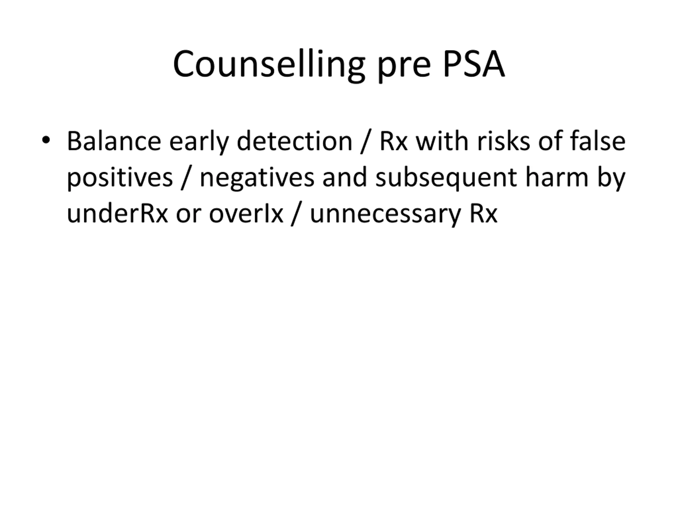 Counselling pre PSA Balance early detection / Rx with risks of false positives / negatives and subsequent harm by underRx or overIx / unnecessary Rx