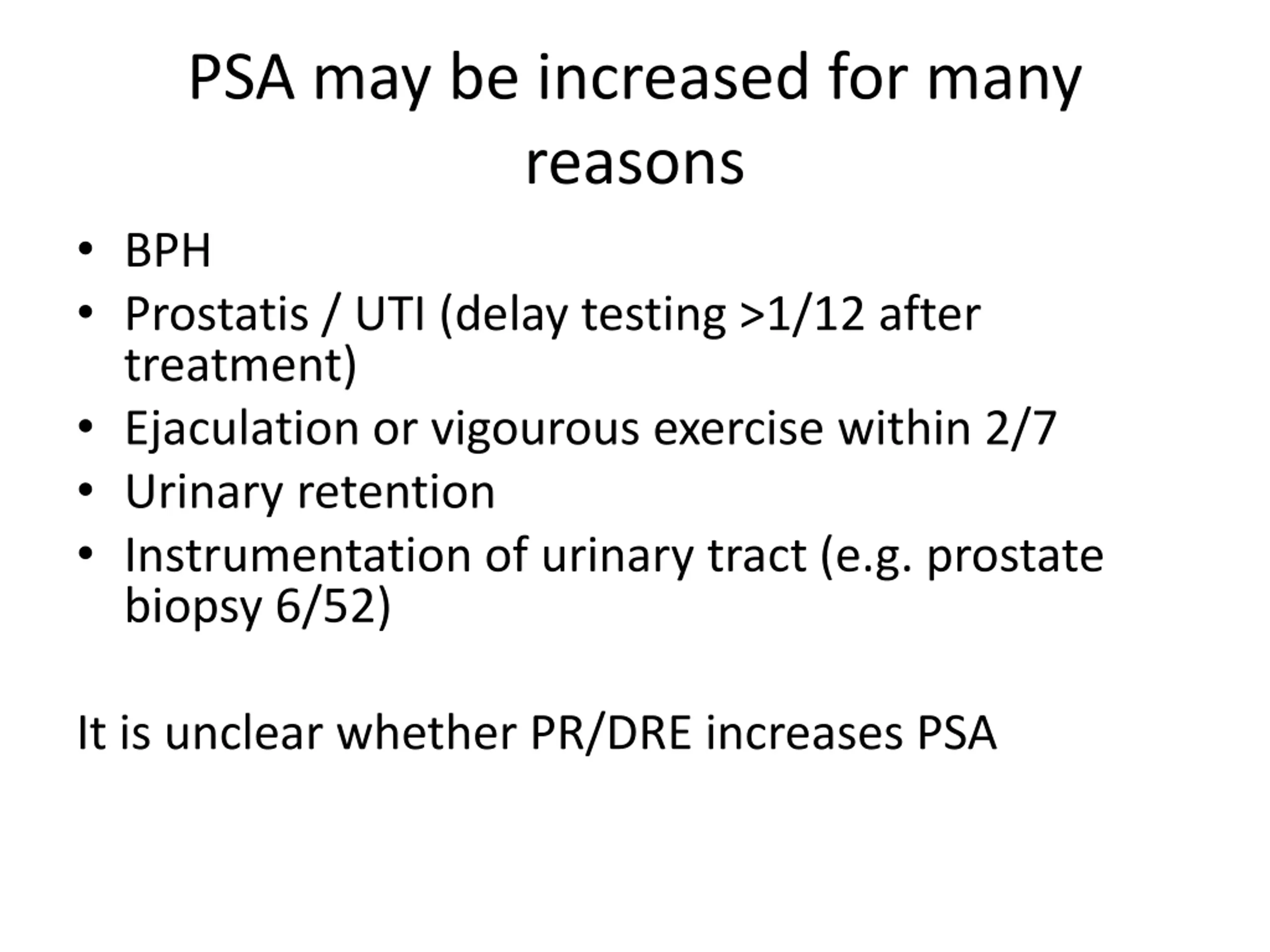 PSA may be increased for many reasons BPH Prostatis / UTI (delay testing >1/12 after treatment) Ejaculation or vigourous exercise within 2/7 Urinary retention Instrumentation of urinary tract (e.g. prostate biopsy 6/52) It is unclear whether PR/DRE increases PSA