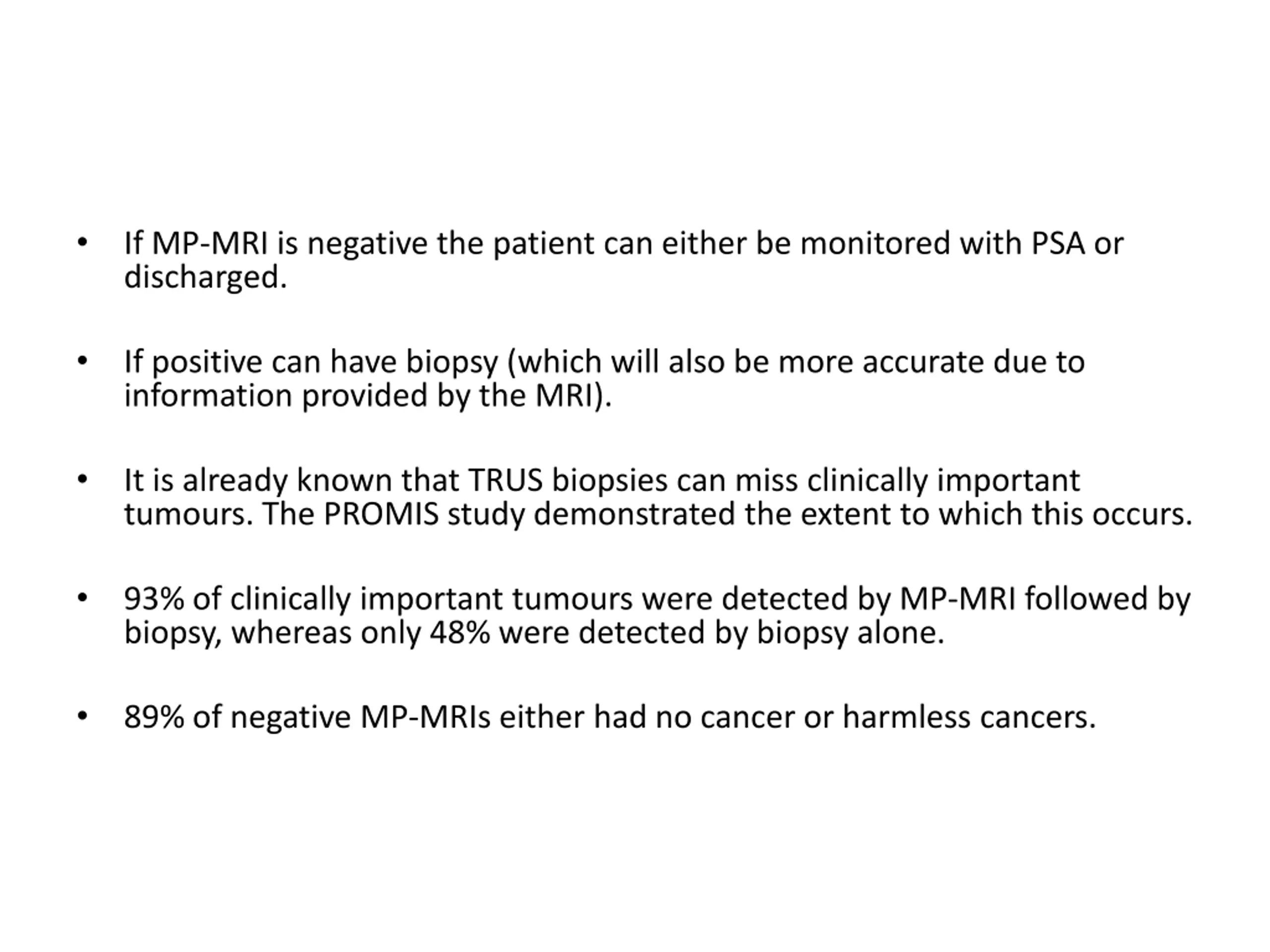If MP-MRI is negative the patient can either be monitored with PSA or discharged. If positive can have biopsy (which will also be more accurate due to information provided by the MRI). It is already known that TRUS biopsies can miss clinically important tumours. The PROMIS study demonstrated the extent to which this occurs. 93% of clinically important tumours were detected by MP-MRI followed by biopsy, whereas only 48% were detected by biopsy alone. 89% of negative MP-MRIs either had no cancer or harmless cancers.