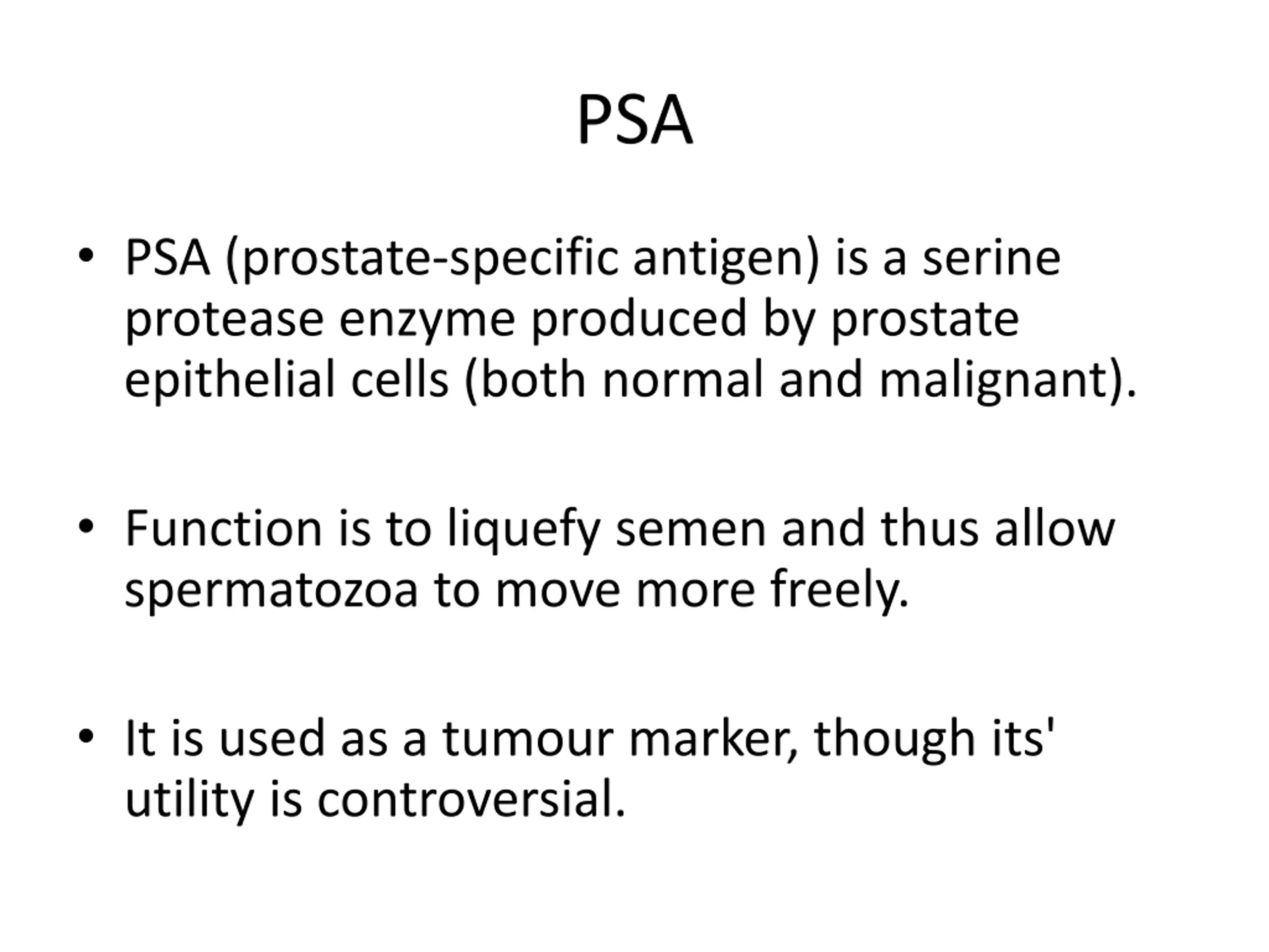 PSA PSA (prostate-specific antigen) is a serine protease enzyme produced by prostate epithelial cells (both normal and malignant). Function is to liquefy semen and thus allow spermatozoa to move more freely. It is used as a tumour marker, though its' utility is controversial.
