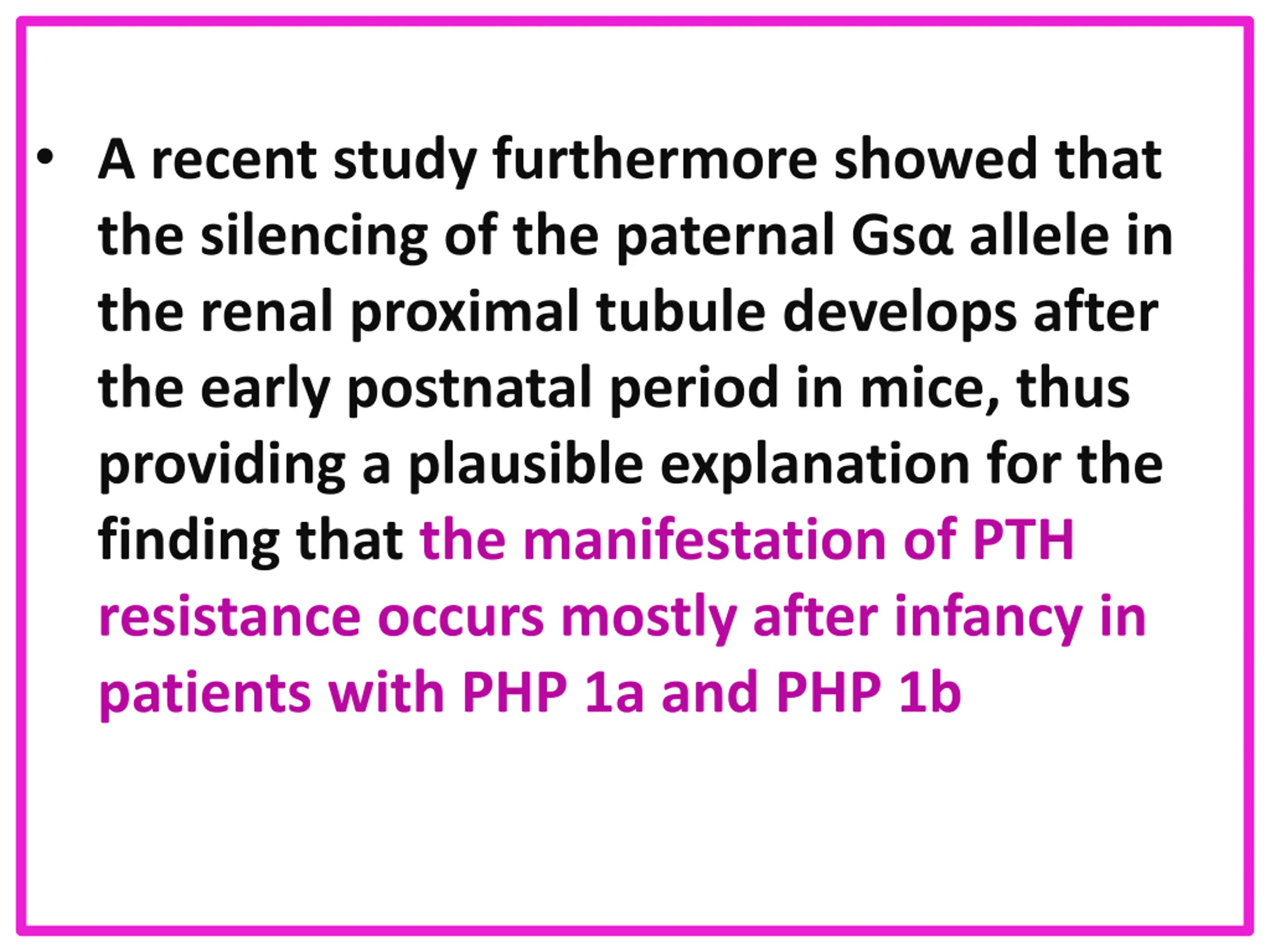 A recent study furthermore showed that the silencing of the paternal Gs allele in the renal proximal tubule develops after the early postnatal period in mice, thus providing a plausible explanation for the finding that the manifestation of PTH resistance occurs mostly after infancy in patients with PHP 1a and PHP 1b