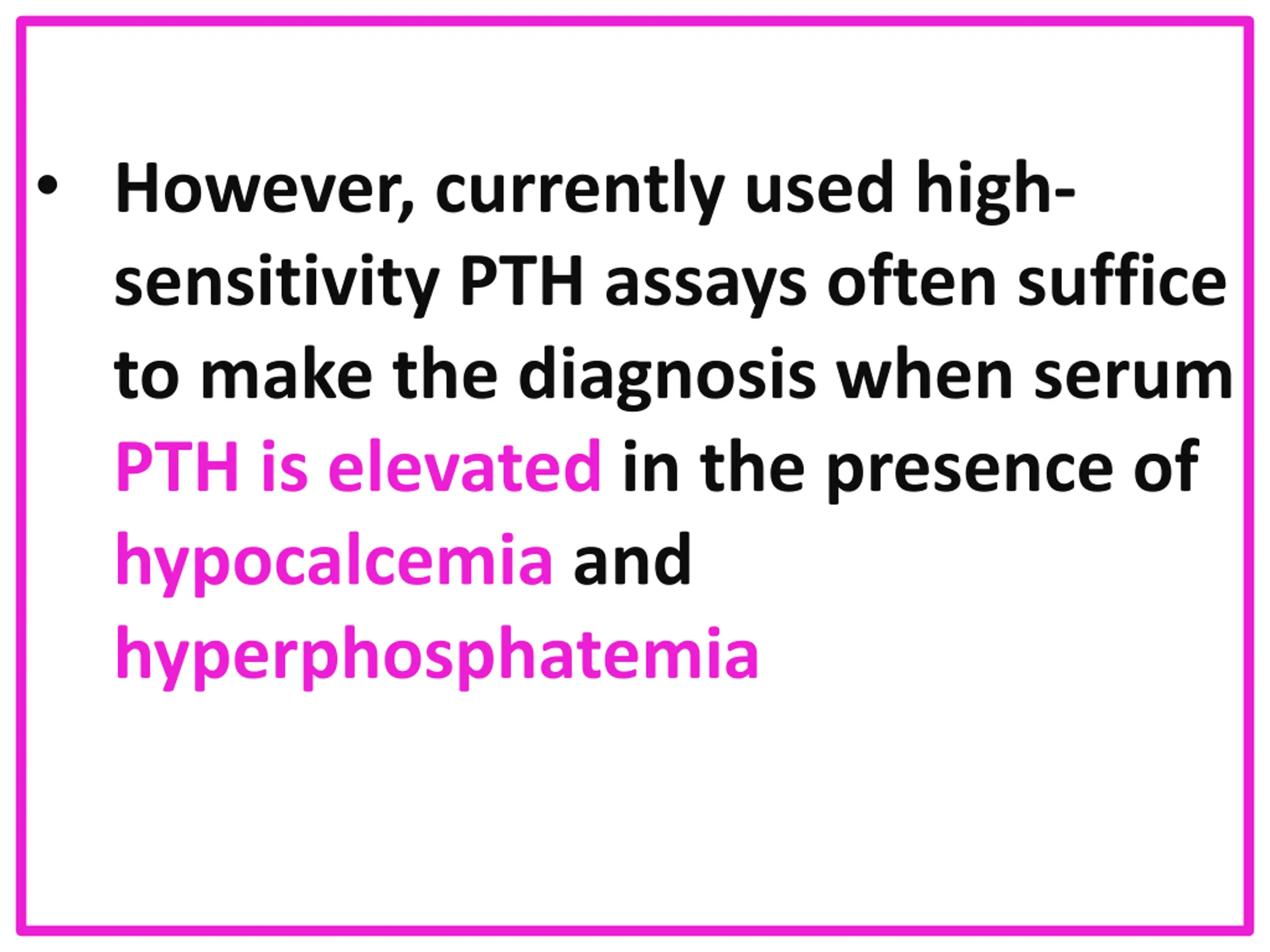 However, currently used high- sensitivity PTH assays often suffice to make the diagnosis when serum PTH is elevated in the presence of hypocalcemia and hyperphosphatemia