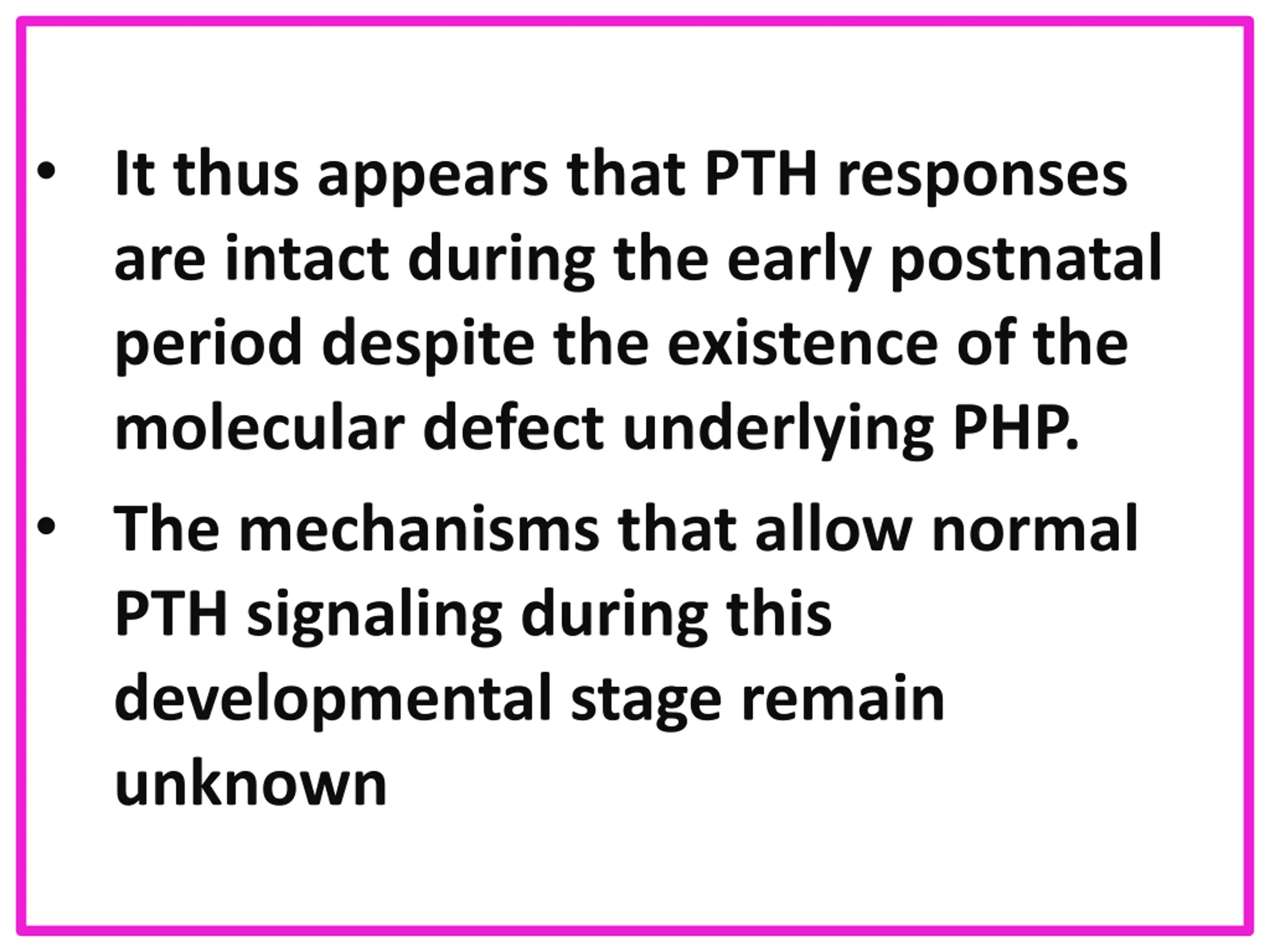 It thus appears that PTH responses are intact during the early postnatal period despite the existence of the molecular defect underlying PHP. The mechanisms that allow normal PTH signaling during this developmental stage remain unknown