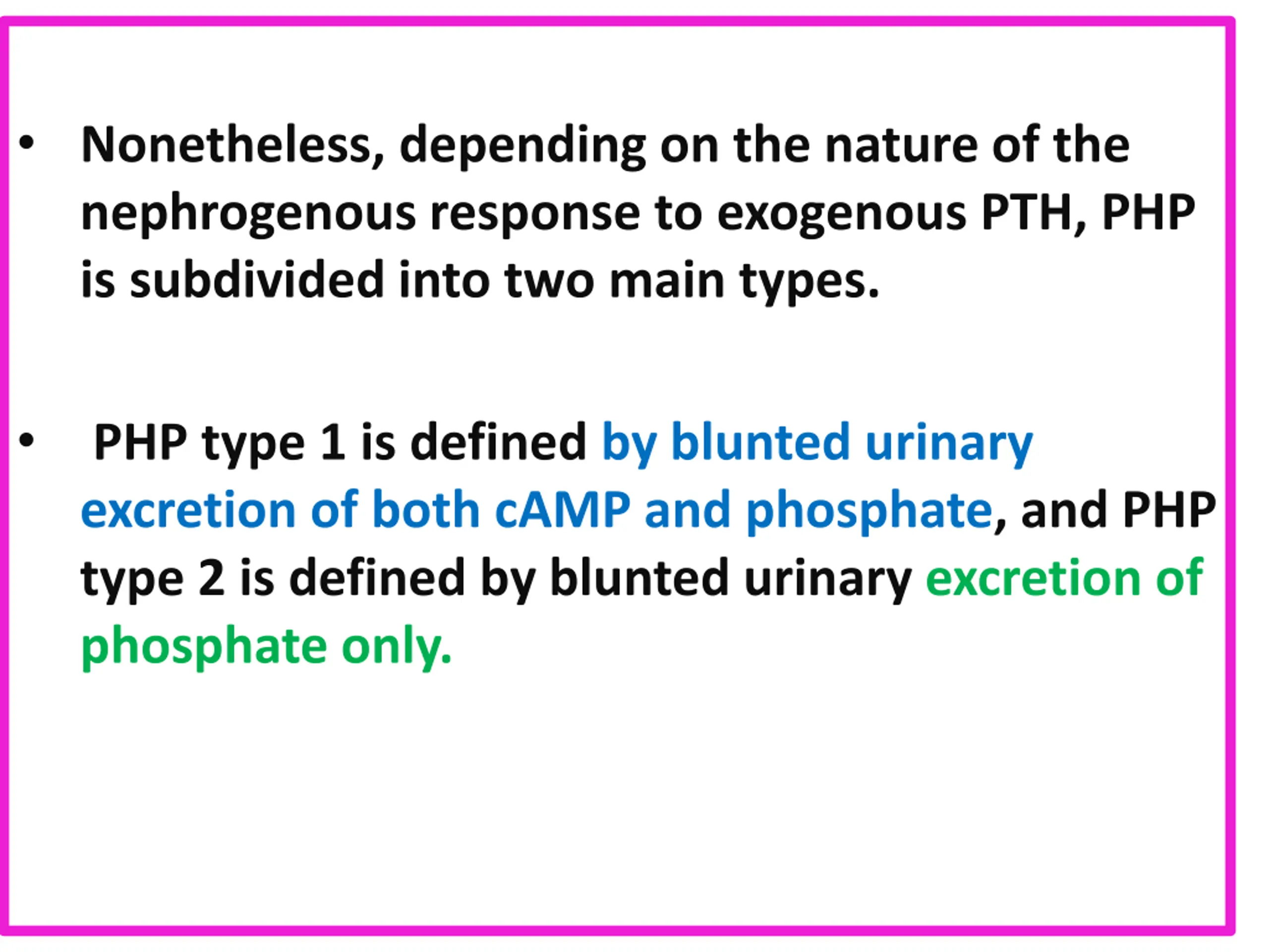 Nonetheless, depending on the nature of the nephrogenous response to exogenous PTH, PHP is subdivided into two main types. PHP type 1 is defined by blunted urinary excretion of both cAMP and phosphate, and PHP type 2 is defined by blunted urinary excretion of phosphate only.