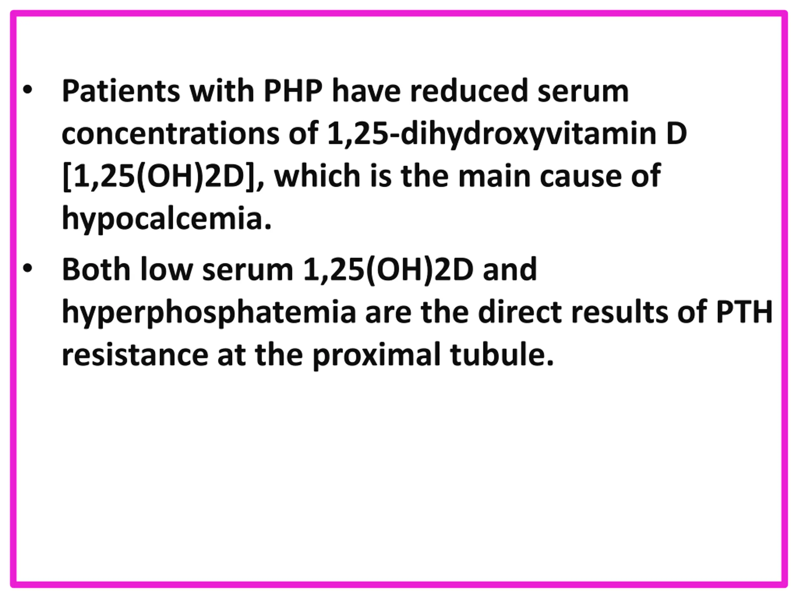 Patients with PHP have reduced serum concentrations of 1,25-dihydroxyvitamin D [1,25(OH)2D], which is the main cause of hypocalcemia. Both low serum 1,25(OH)2D and hyperphosphatemia are the direct results of PTH resistance at the proximal tubule.