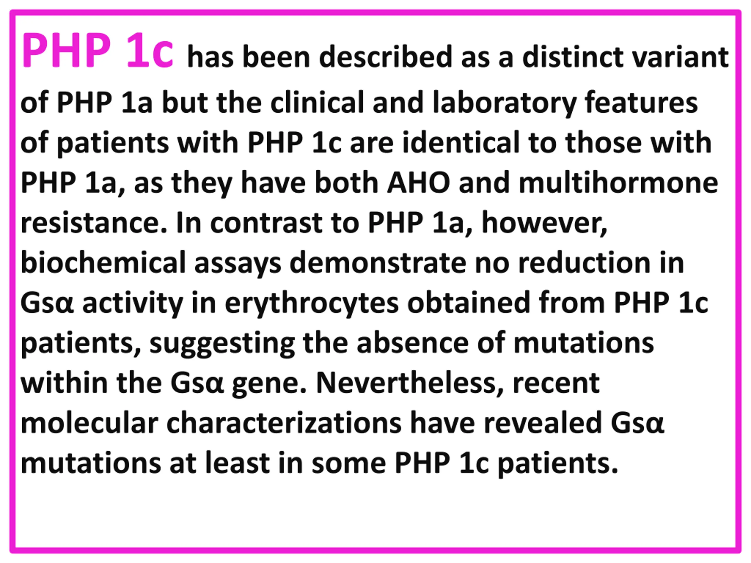 PHP 1c has been described as a distinct variant of PHP 1a but the clinical and laboratory features of patients with PHP 1c are identical to those with PHP 1a, as they have both AHO and multihormone resistance. In contrast to PHP 1a, however, biochemical assays demonstrate no reduction in Gs activity in erythrocytes obtained from PHP 1c patients, suggesting the absence of mutations within the Gs gene. Nevertheless, recent molecular characterizations have revealed Gs mutations at least in some PHP 1c patients.