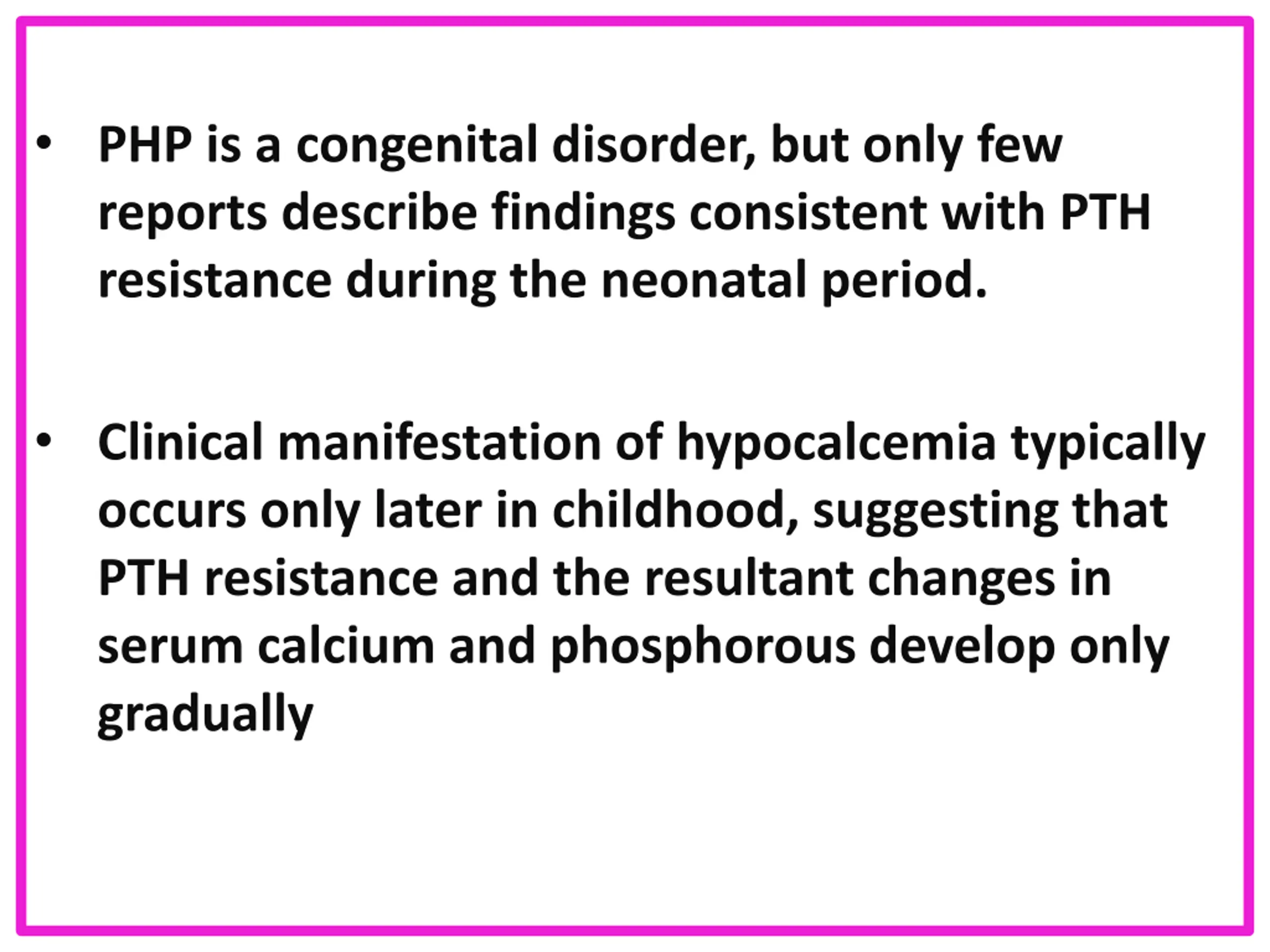 PHP is a congenital disorder, but only few reports describe findings consistent with PTH resistance during the neonatal period. Clinical manifestation of hypocalcemia typically occurs only later in childhood, suggesting that PTH resistance and the resultant changes in serum calcium and phosphorous develop only gradually