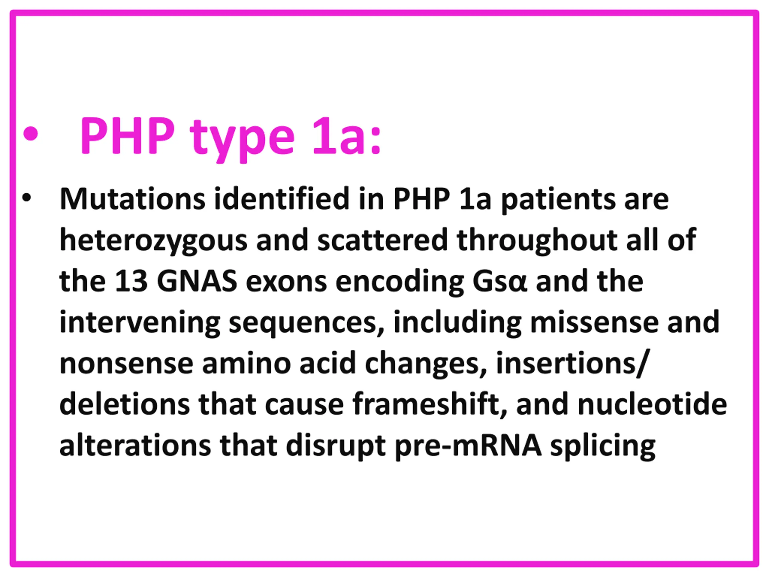 PHP type 1a: Mutations identified in PHP 1a patients are heterozygous and scattered throughout all of the 13 GNAS exons encoding Gs and the intervening sequences, including missense and nonsense amino acid changes, insertions/ deletions that cause frameshift, and nucleotide alterations that disrupt pre-mRNA splicing