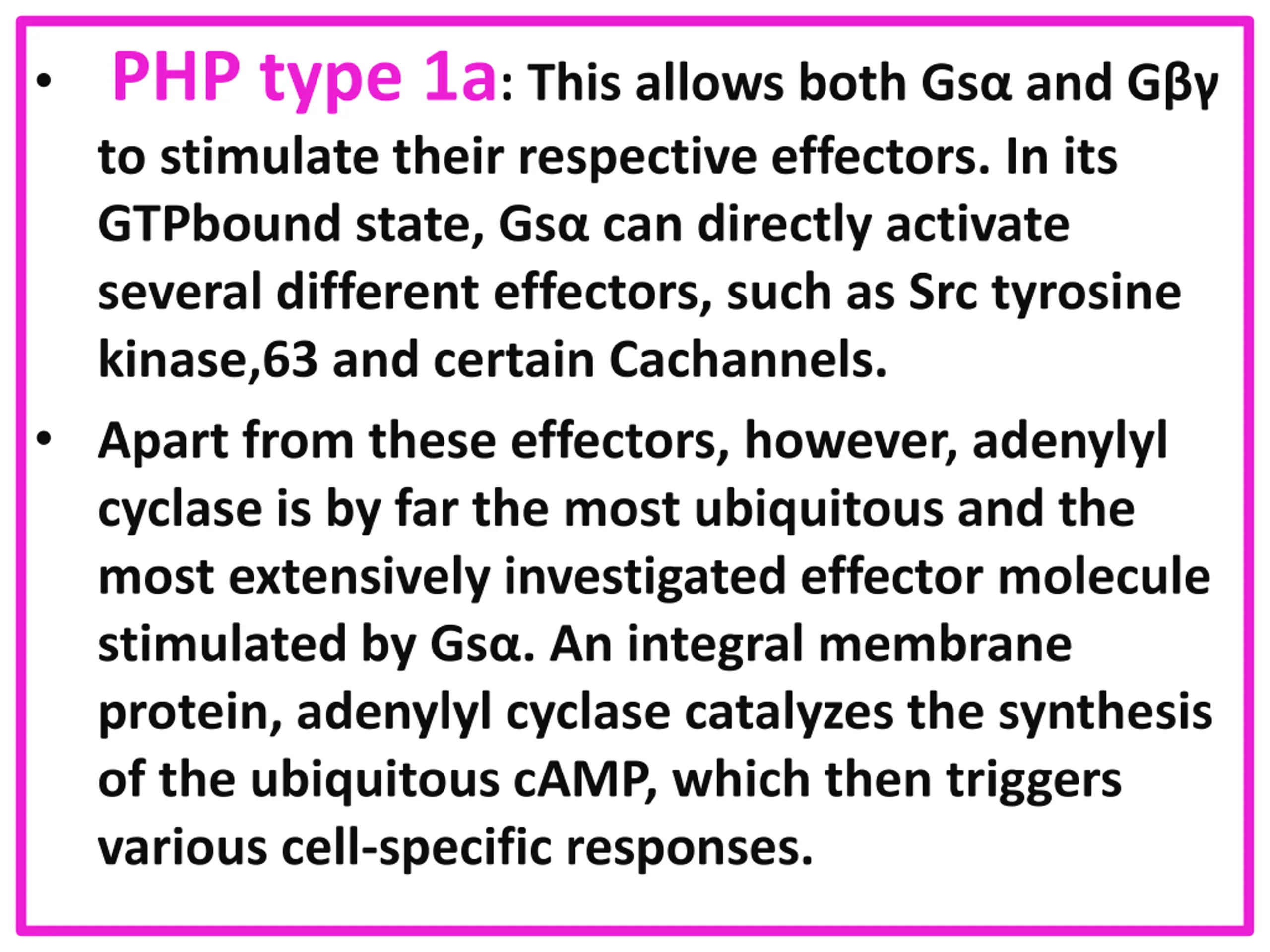 PHP type 1a: The activation of adenylyl cyclase and other effectors by Gs is regulated by the intrinsic GTP hydrolase (GTPase) activity of Gs . Conversion of GTP into GDP results in the re- assembly of the G protein heterotrimer and, thereby, prevents further effector stimulation