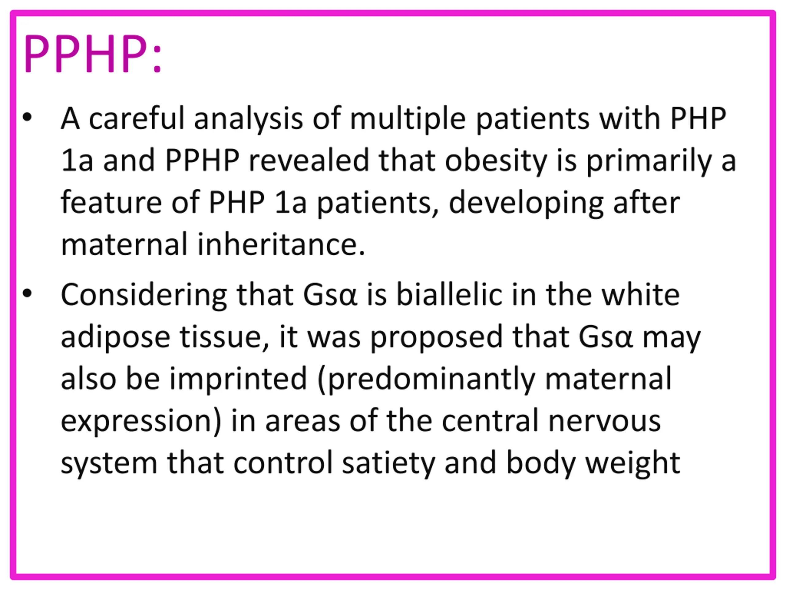 PPHP: A careful analysis of multiple patients with PHP 1a and PPHP revealed that obesity is primarily a feature of PHP 1a patients, developing after maternal inheritance. Considering that Gs is biallelic in the white adipose tissue, it was proposed that Gs may also be imprinted (predominantly maternal expression) in areas of the central nervous system that control satiety and body weight