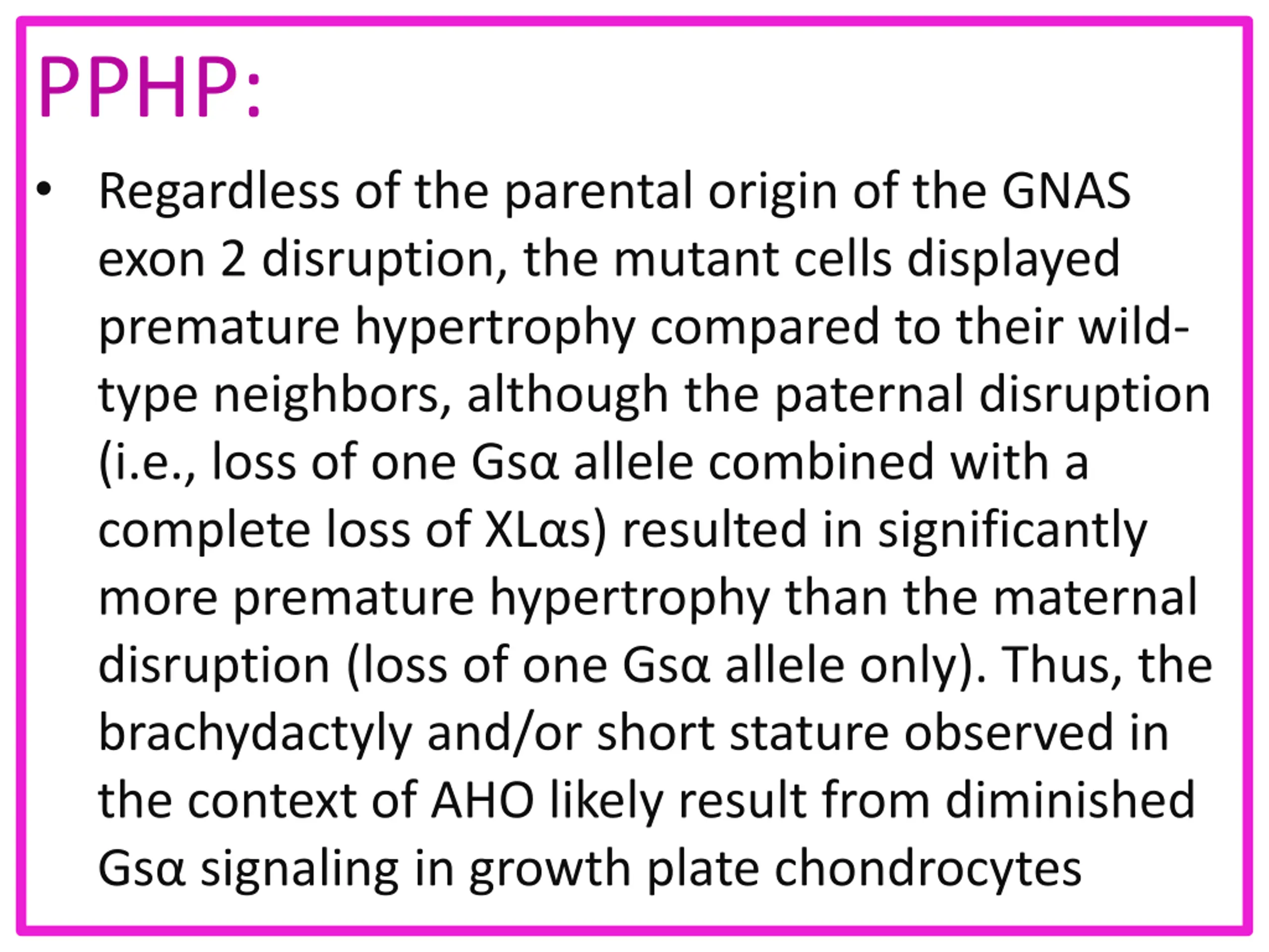 PPHP: Regardless of the parental origin of the GNAS exon 2 disruption, the mutant cells displayed premature hypertrophy compared to their wild- type neighbors, although the paternal disruption (i.e., loss of one Gs allele combined with a complete loss of XL s) resulted in significantly more premature hypertrophy than the maternal disruption (loss of one Gs allele only). Thus, the brachydactyly and/or short stature observed in the context of AHO likely result from diminished Gs signaling in growth plate chondrocytes