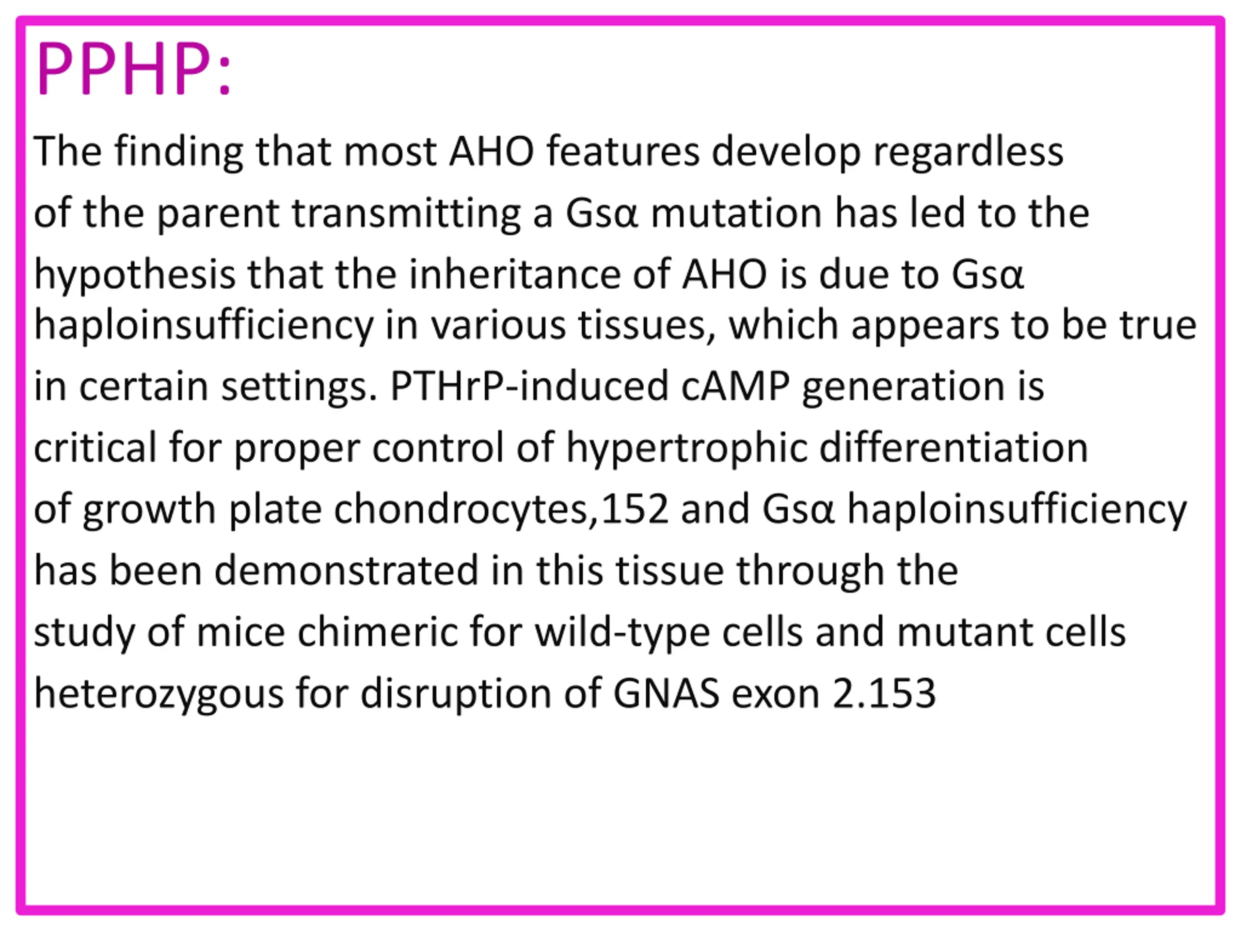 PPHP: The finding that most AHO features develop regardless of the parent transmitting a Gs mutation has led to the hypothesis that the inheritance of AHO is due to Gs haploinsufficiency in various tissues, which appears to be true in certain settings. PTHrP-induced cAMP generation is critical for proper control of hypertrophic differentiation of growth plate chondrocytes,152 and Gs haploinsufficiency has been demonstrated in this tissue through the study of mice chimeric for wild-type cells and mutant cells heterozygous for disruption of GNAS exon 2.153
