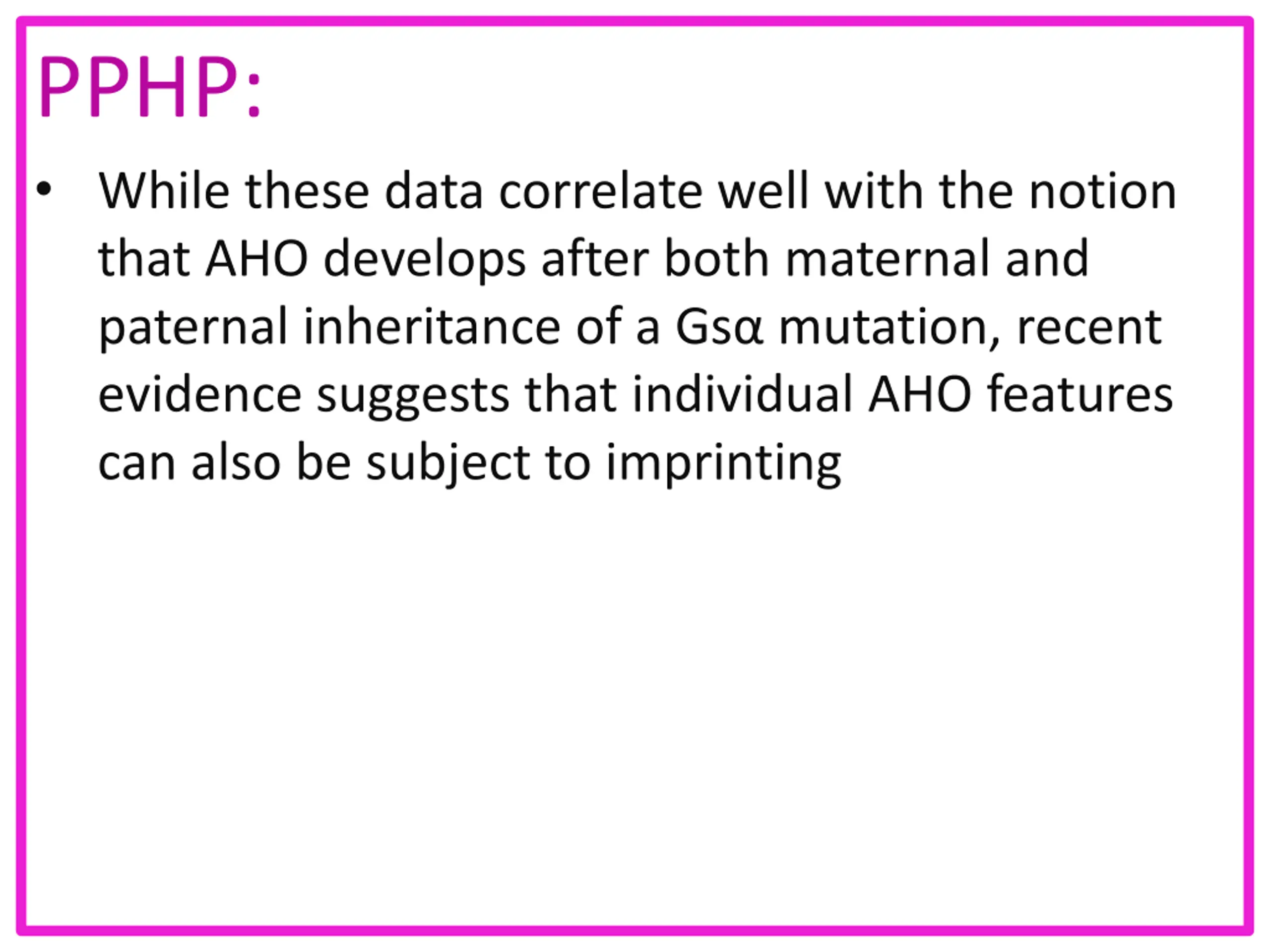 PPHP: While these data correlate well with the notion that AHO develops after both maternal and paternal inheritance of a Gs mutation, recent evidence suggests that individual AHO features can also be subject to imprinting