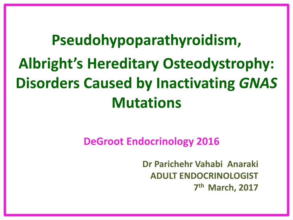 Pseudohypoparathyroidism, Albright s Hereditary Osteodystrophy: Disorders Caused by Inactivating GNAS Mutations DeGroot Endocrinology 2016 Dr Parichehr Vahabi Anaraki ADULT ENDOCRINOLOGIST 7th March, 2017