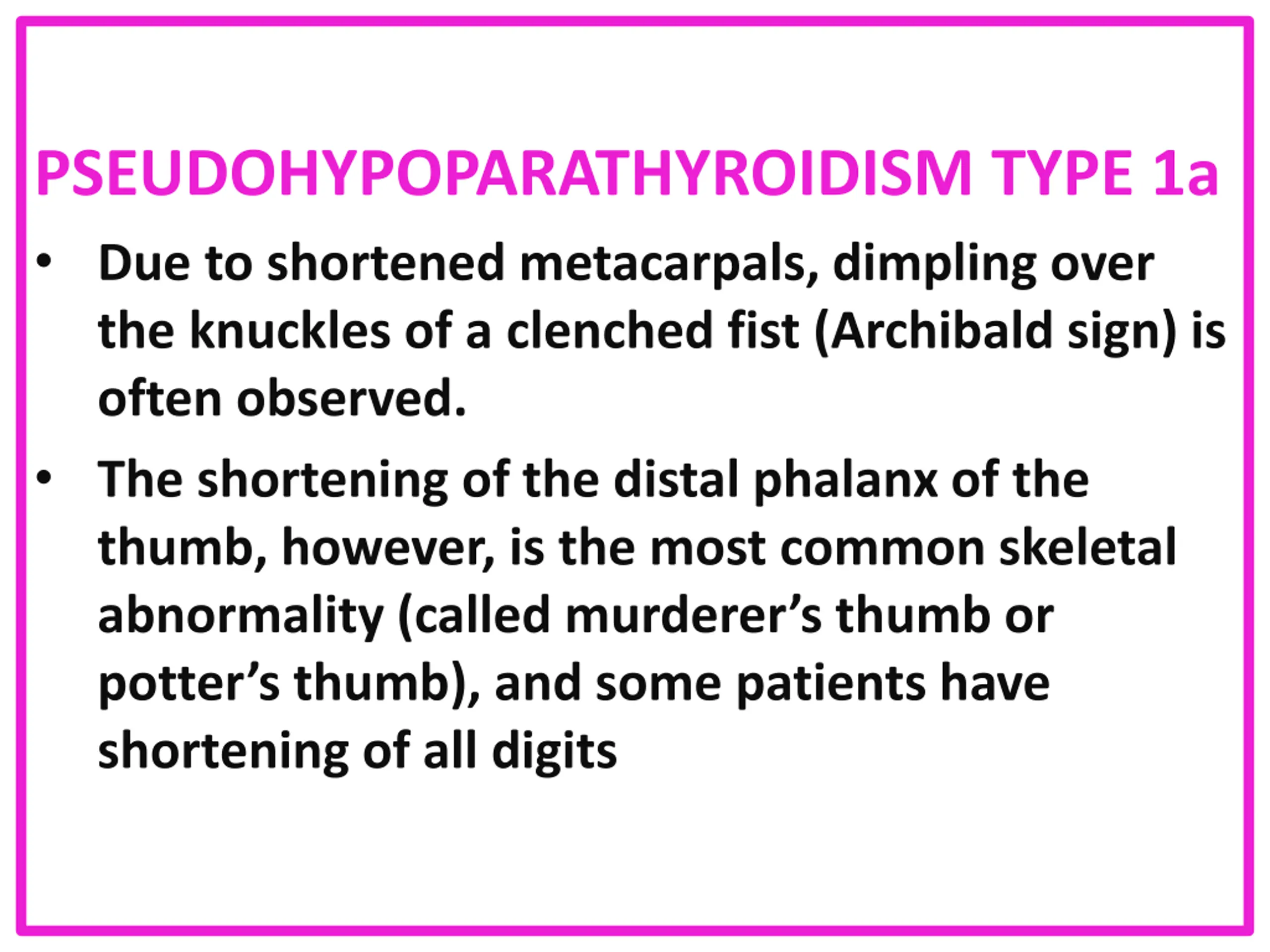 PSEUDOHYPOPARATHYROIDISM TYPE 1a Due to shortened metacarpals, dimpling over the knuckles of a clenched fist (Archibald sign) is often observed. The shortening of the distal phalanx of the thumb, however, is the most common skeletal abnormality (called murderer s thumb or potter s thumb), and some patients have shortening of all digits