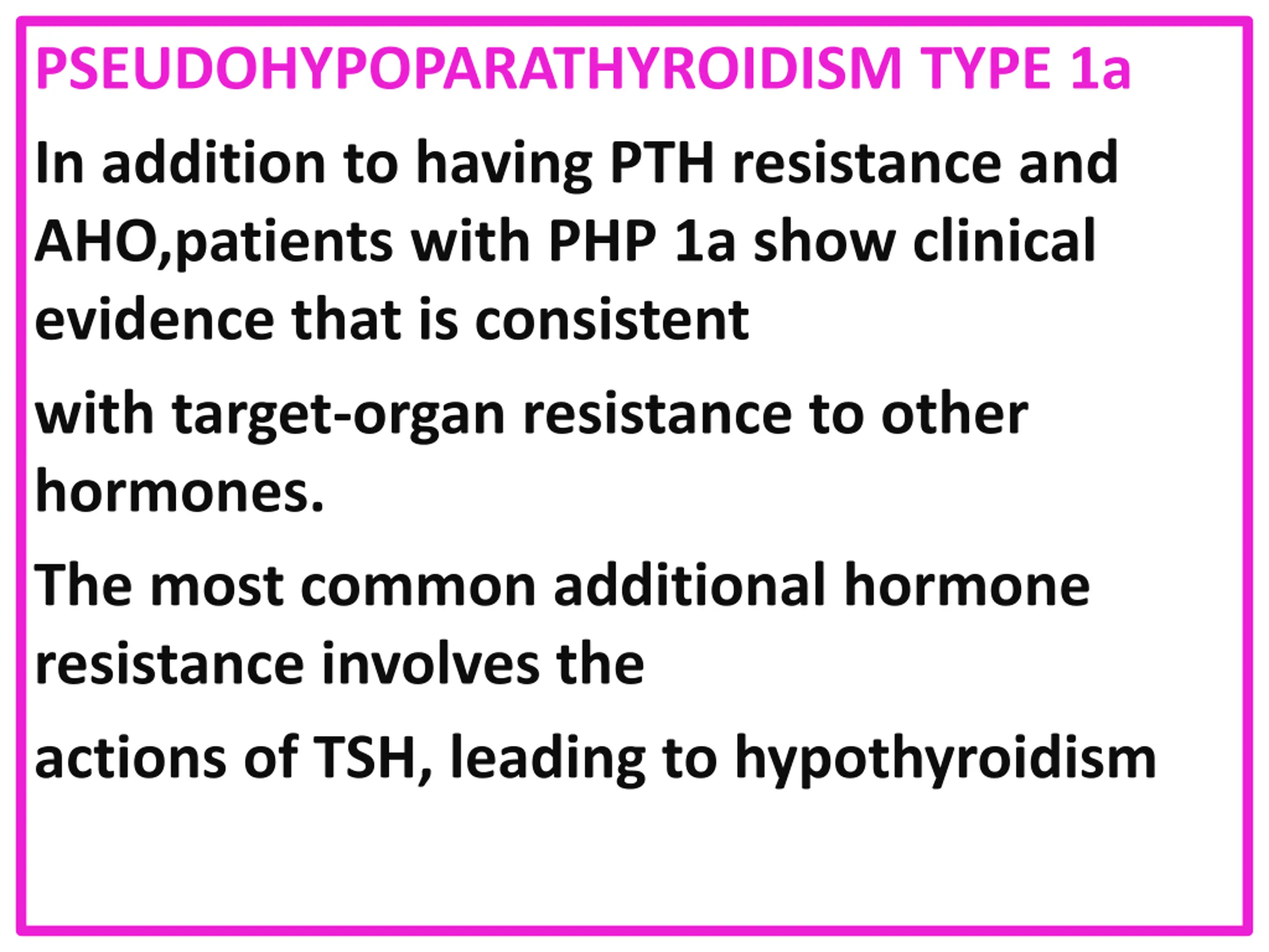 PSEUDOHYPOPARATHYROIDISM TYPE 1a In addition to having PTH resistance and AHO,patients with PHP 1a show clinical evidence that is consistent with target-organ resistance to other hormones. The most common additional hormone resistance involves the actions of TSH, leading to hypothyroidism