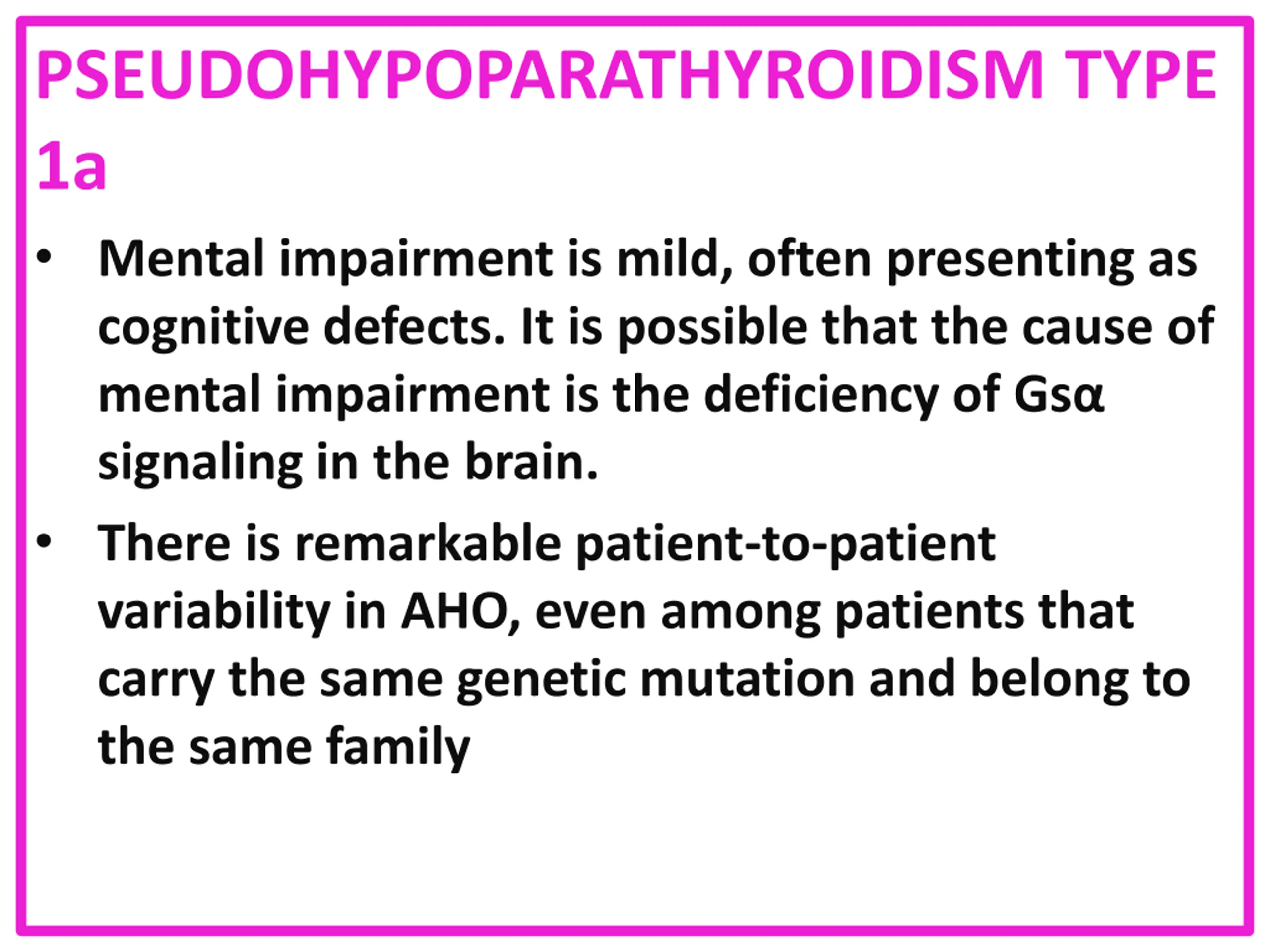 PSEUDOHYPOPARATHYROIDISM TYPE 1a Mental impairment is mild, often presenting as cognitive defects. It is possible that the cause of mental impairment is the deficiency of Gs signaling in the brain. There is remarkable patient-to-patient variability in AHO, even among patients that carry the same genetic mutation and belong to the same family
