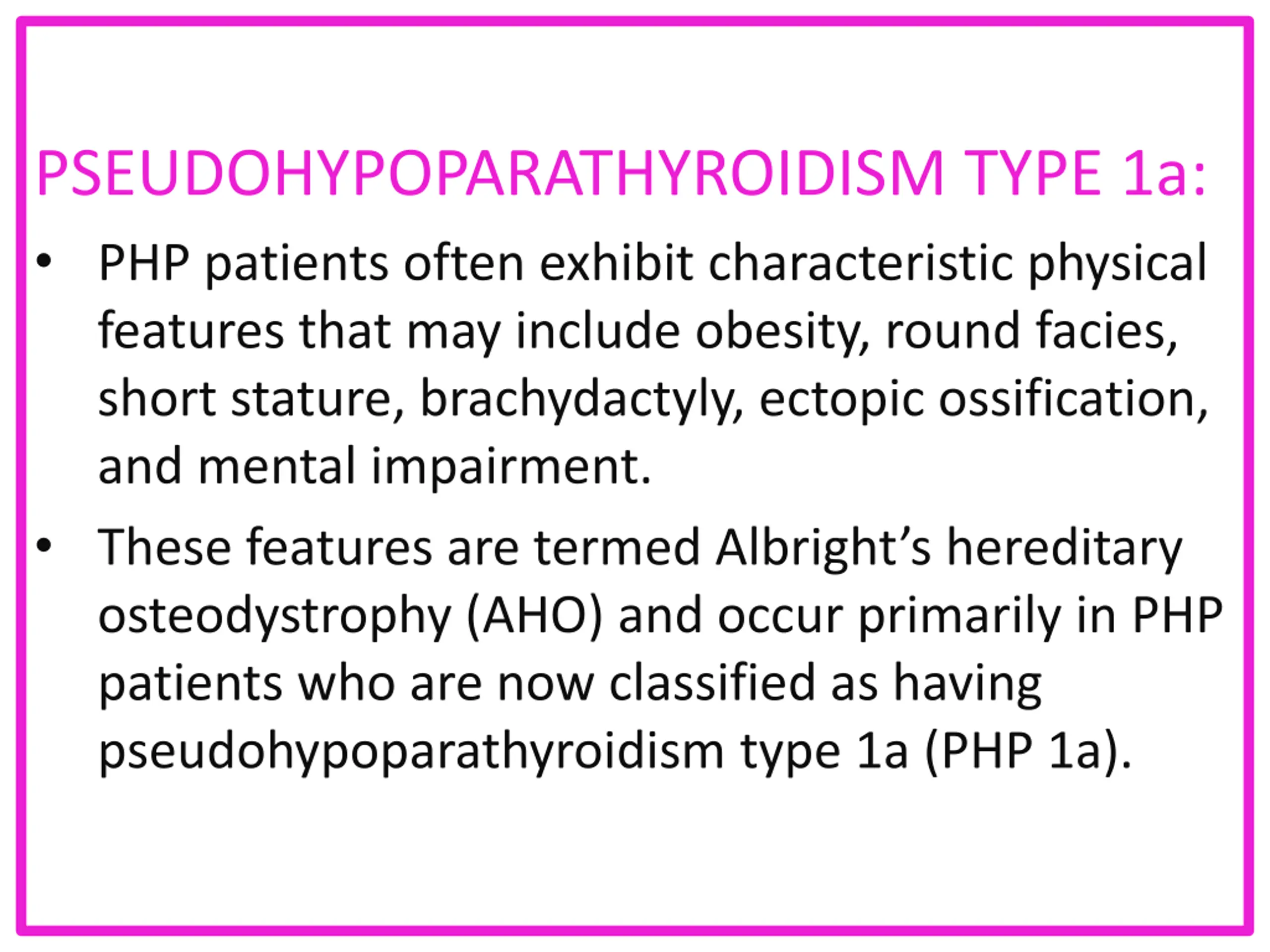 PSEUDOHYPOPARATHYROIDISM TYPE 1a: PHP patients often exhibit characteristic physical features that may include obesity, round facies, short stature, brachydactyly, ectopic ossification, and mental impairment. These features are termed Albright s hereditary osteodystrophy (AHO) and occur primarily in PHP patients who are now classified as having pseudohypoparathyroidism type 1a (PHP 1a).