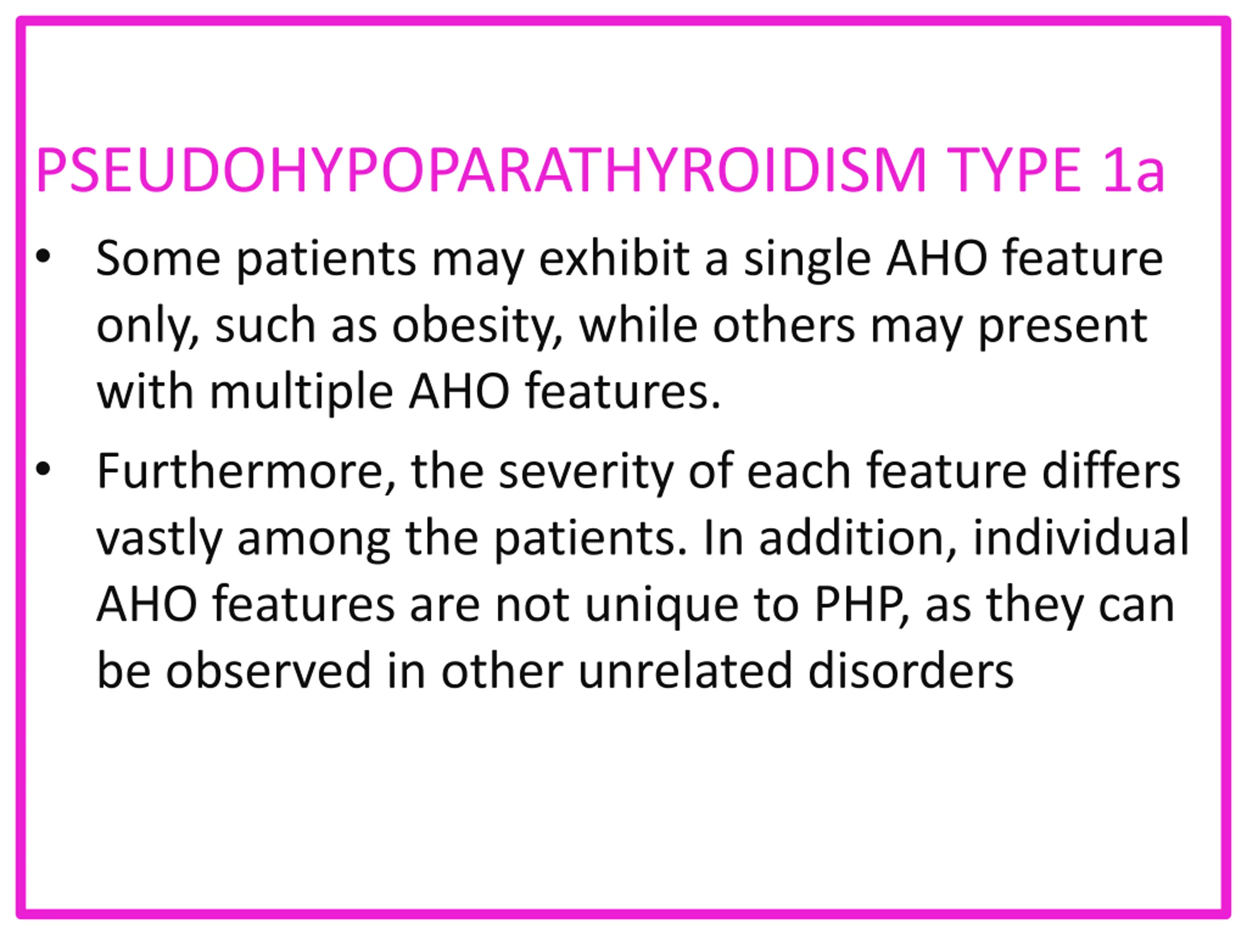 PSEUDOHYPOPARATHYROIDISM TYPE 1a Some patients may exhibit a single AHO feature only, such as obesity, while others may present with multiple AHO features. Furthermore, the severity of each feature differs vastly among the patients. In addition, individual AHO features are not unique to PHP, as they can be observed in other unrelated disorders