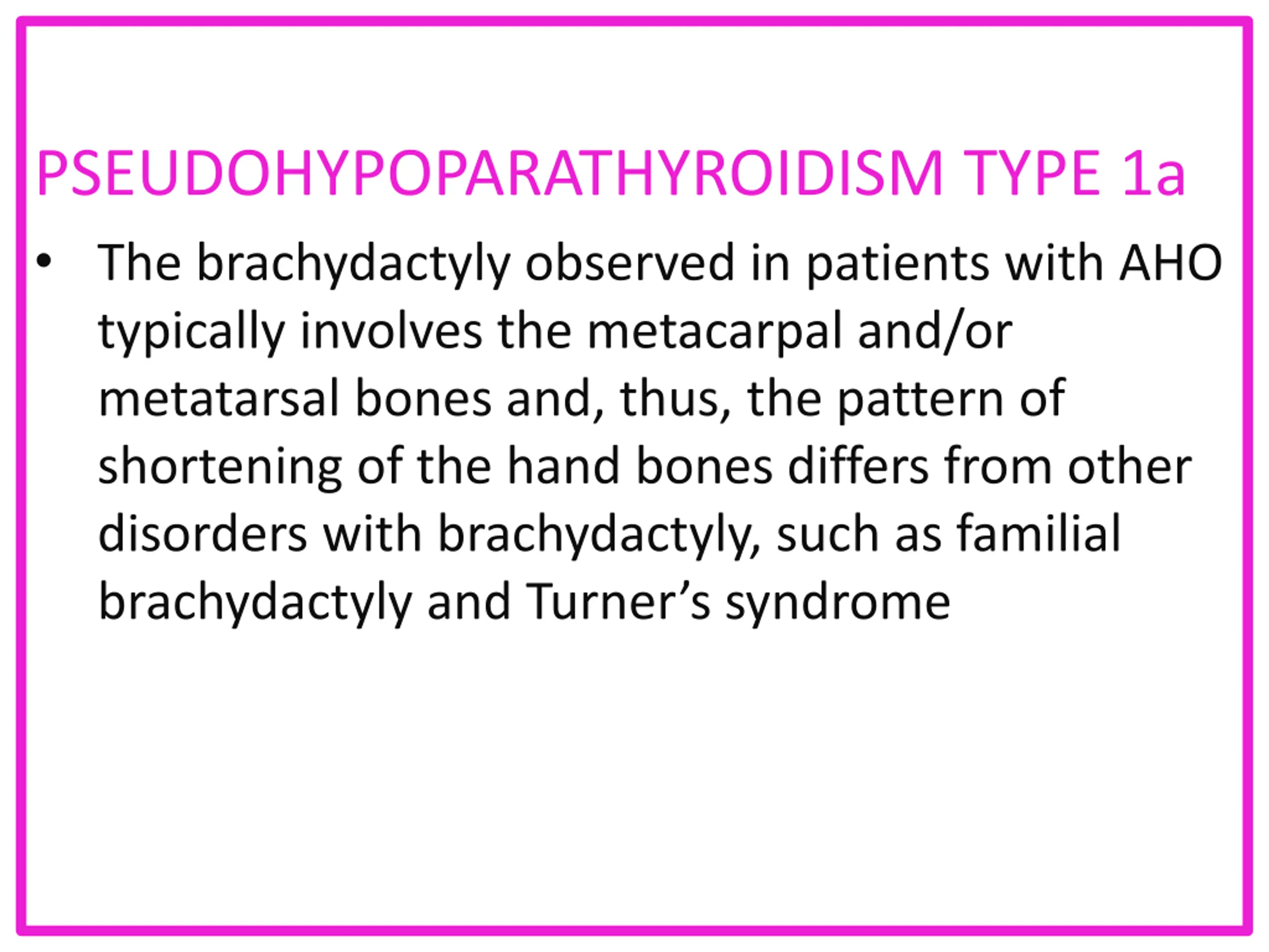 PSEUDOHYPOPARATHYROIDISM TYPE 1a The brachydactyly observed in patients with AHO typically involves the metacarpal and/or metatarsal bones and, thus, the pattern of shortening of the hand bones differs from other disorders with brachydactyly, such as familial brachydactyly and Turner s syndrome