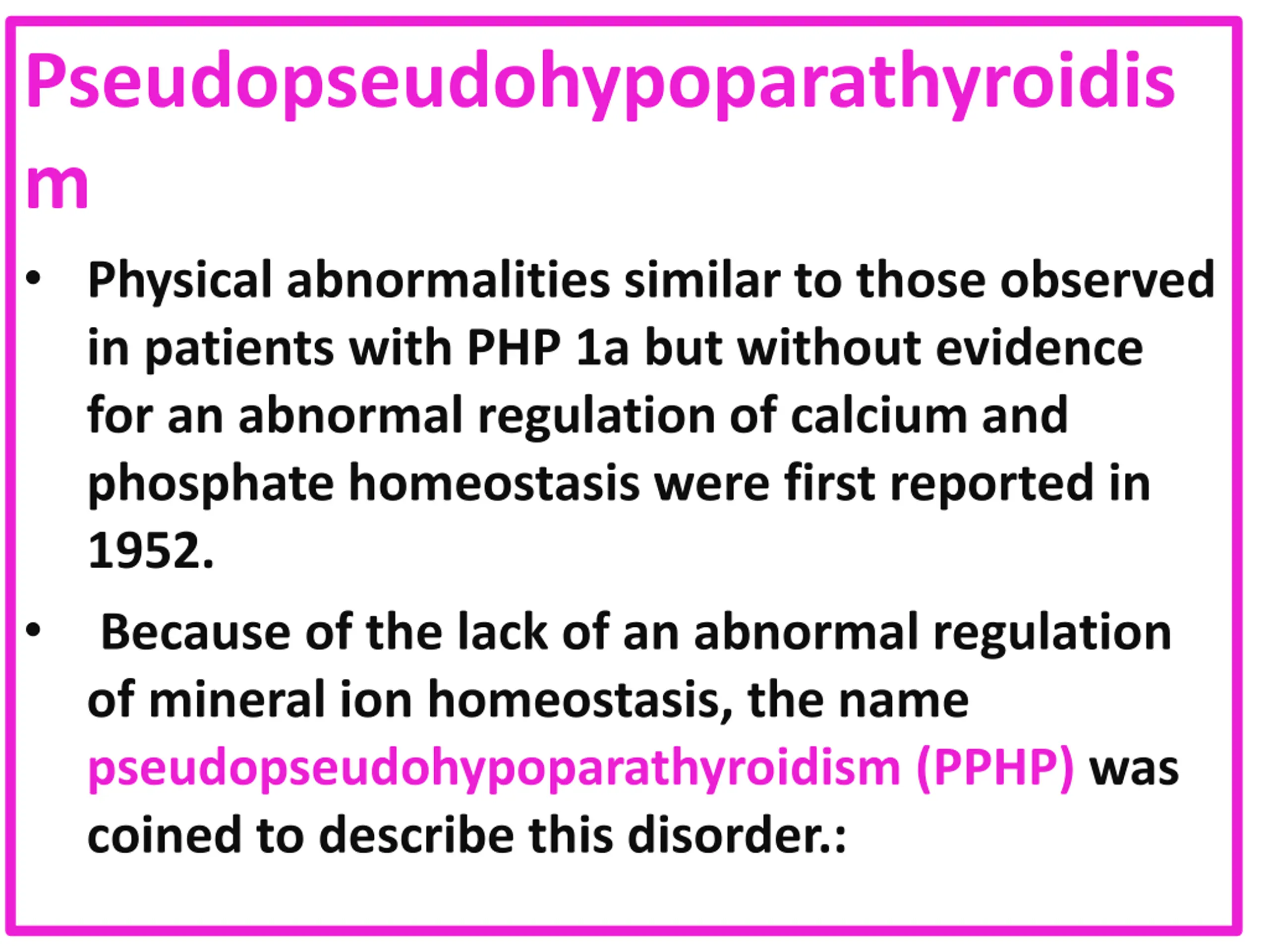 Pseudopseudohypoparathyroidis m Physical abnormalities similar to those observed in patients with PHP 1a but without evidence for an abnormal regulation of calcium and phosphate homeostasis were first reported in 1952. Because of the lack of an abnormal regulation of mineral ion homeostasis, the name pseudopseudohypoparathyroidism (PPHP) was coined to describe this disorder.: