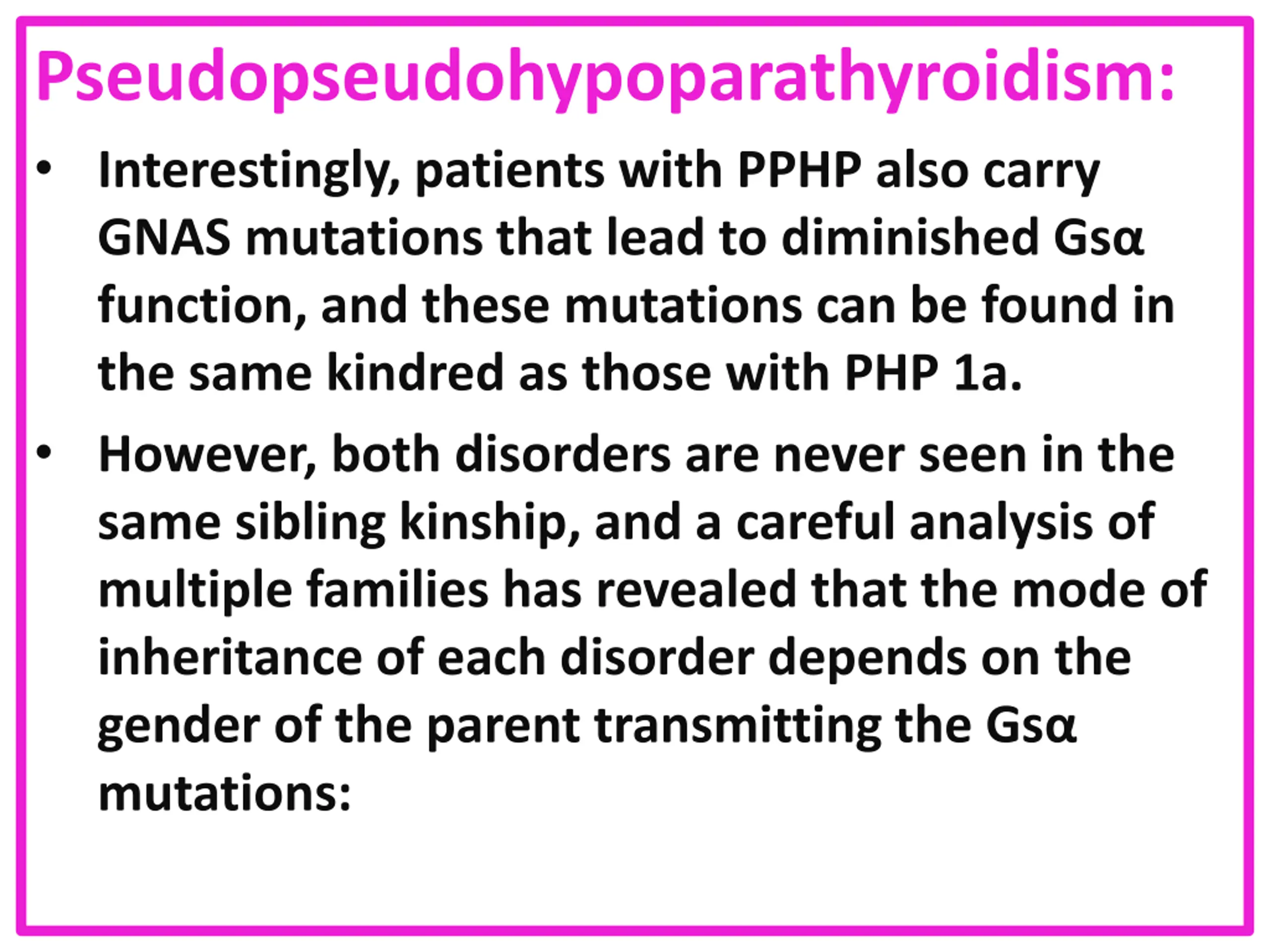 Pseudopseudohypoparathyroidism: Interestingly, patients with PPHP also carry GNAS mutations that lead to diminished Gs function, and these mutations can be found in the same kindred as those with PHP 1a. However, both disorders are never seen in the same sibling kinship, and a careful analysis of multiple families has revealed that the mode of inheritance of each disorder depends on the gender of the parent transmitting the Gs mutations: