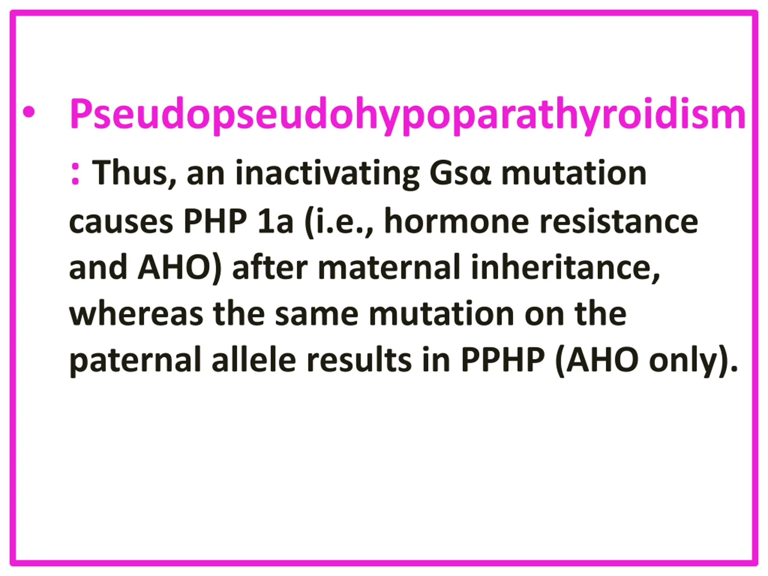 Pseudopseudohypoparathyroidism : Thus, an inactivating Gs mutation causes PHP 1a (i.e., hormone resistance and AHO) after maternal inheritance, whereas the same mutation on the paternal allele results in PPHP (AHO only).