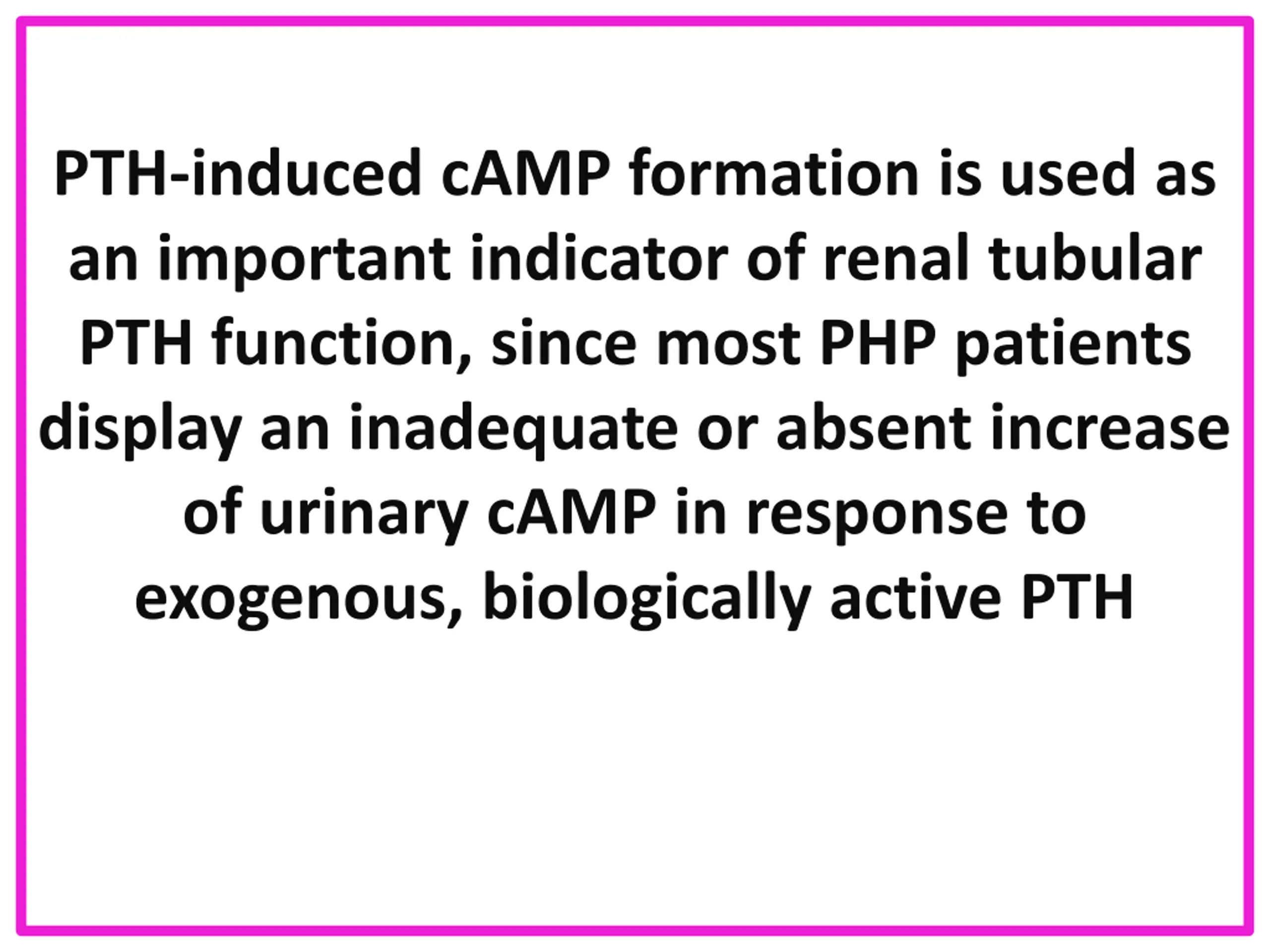 PTH-induced cAMP formation is used as an important indicator of renal tubular PTH function, since most PHP patients display an inadequate or absent increase of urinary cAMP in response to exogenous, biologically active PTH