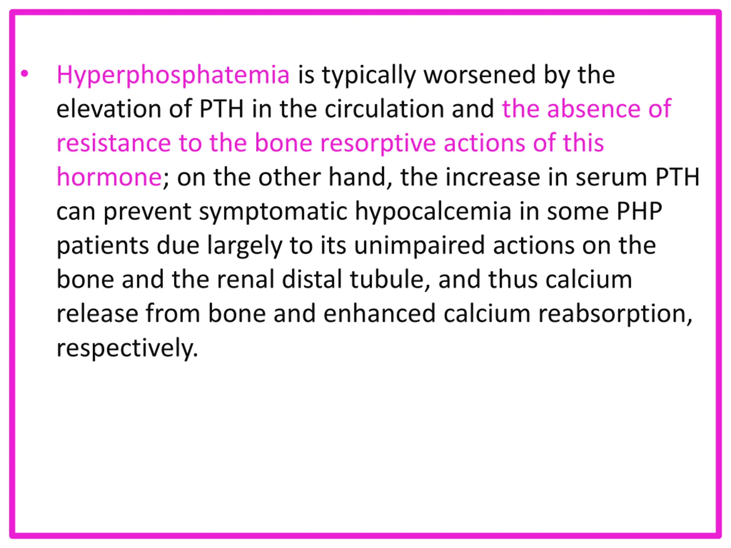 Hyperphosphatemia is typically worsened by the elevation of PTH in the circulation and the absence of resistance to the bone resorptive actions of this hormone; on the other hand, the increase in serum PTH can prevent symptomatic hypocalcemia in some PHP patients due largely to its unimpaired actions on the bone and the renal distal tubule, and thus calcium release from bone and enhanced calcium reabsorption, respectively.