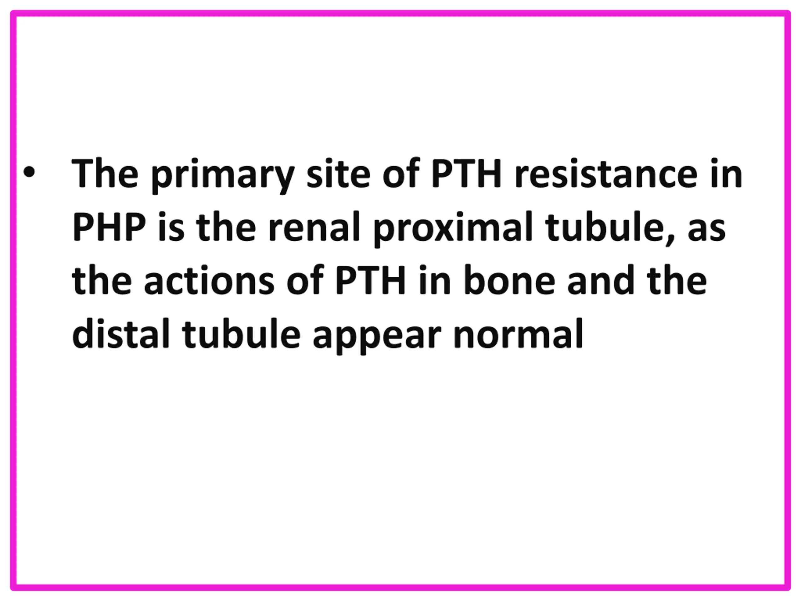 The primary site of PTH resistance in PHP is the renal proximal tubule, as the actions of PTH in bone and the distal tubule appear normal