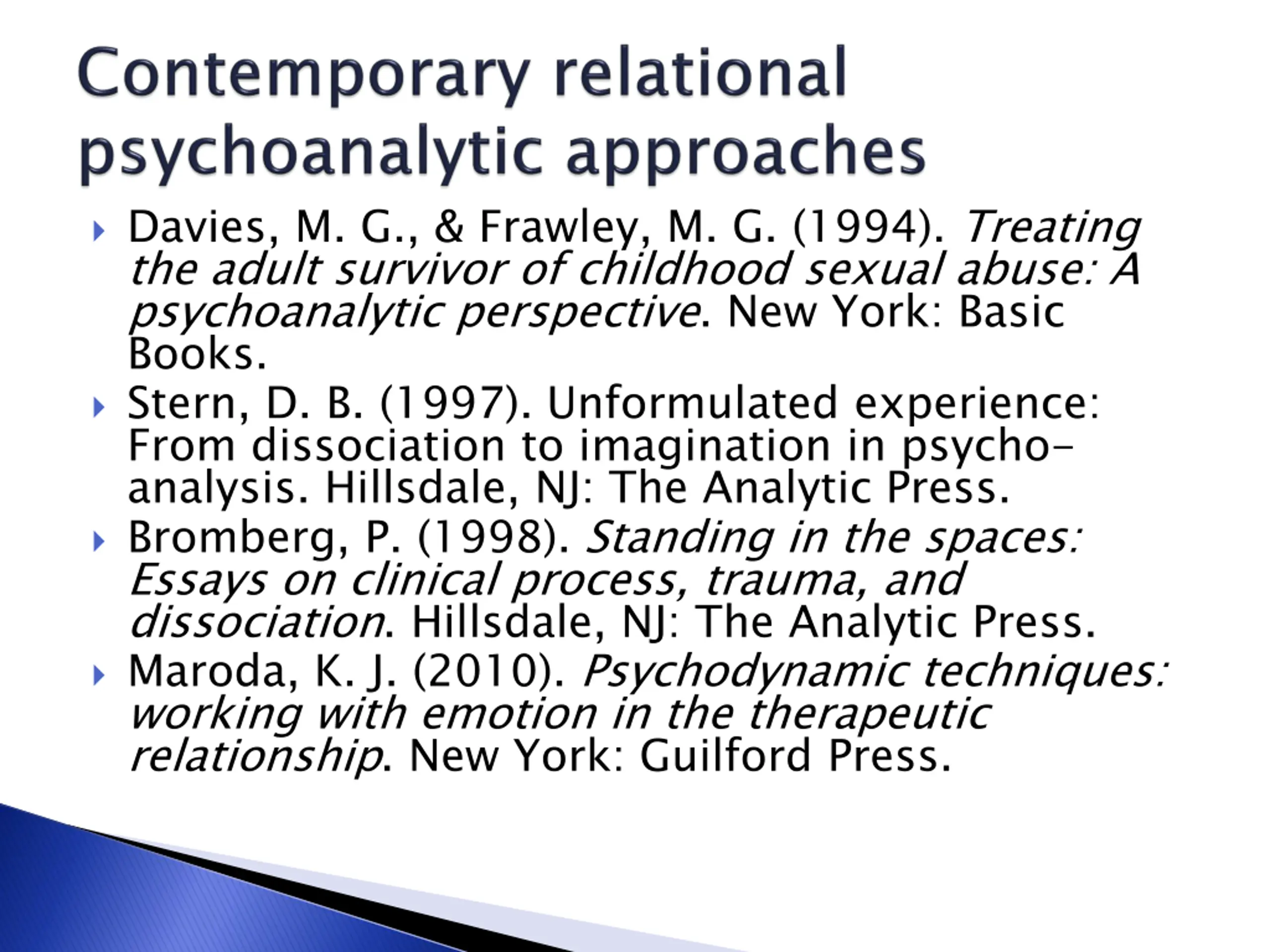 Davies, M. G., & Frawley, M. G. (1994). Treating the adult survivor of childhood sexual abuse: A psychoanalytic perspective. New York: Basic Books. Stern, D. B. (1997). Unformulated experience: From dissociation to imagination in psycho- analysis. Hillsdale, NJ: The Analytic Press. Bromberg, P. (1998). Standing in the spaces: Essays on clinical process, trauma, and dissociation. Hillsdale, NJ: The Analytic Press. Maroda, K. J. (2010). Psychodynamic techniques: working with emotion in the therapeutic relationship. New York: Guilford Press.