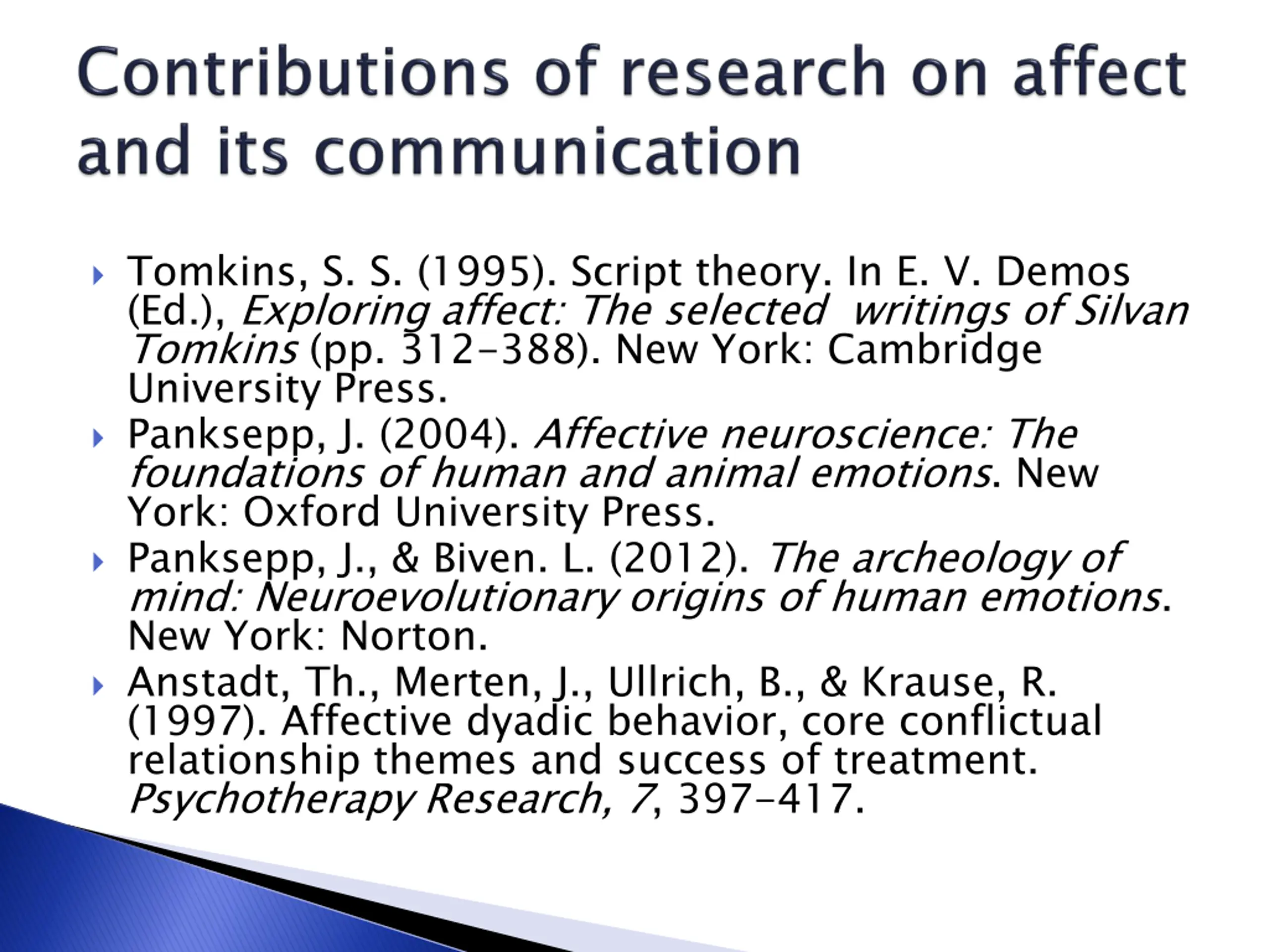 Tomkins, S. S. (1995). Script theory. In E. V. Demos (Ed.), Exploring affect: The selected writings of Silvan Tomkins (pp. 312-388). New York: Cambridge University Press. Panksepp, J. (2004). Affective neuroscience: The foundations of human and animal emotions. New York: Oxford University Press. Panksepp, J., & Biven. L. (2012). The archeology of mind: Neuroevolutionary origins of human emotions. New York: Norton. Anstadt, Th., Merten, J., Ullrich, B., & Krause, R. (1997). Affective dyadic behavior, core conflictual relationship themes and success of treatment. Psychotherapy Research, 7, 397-417.