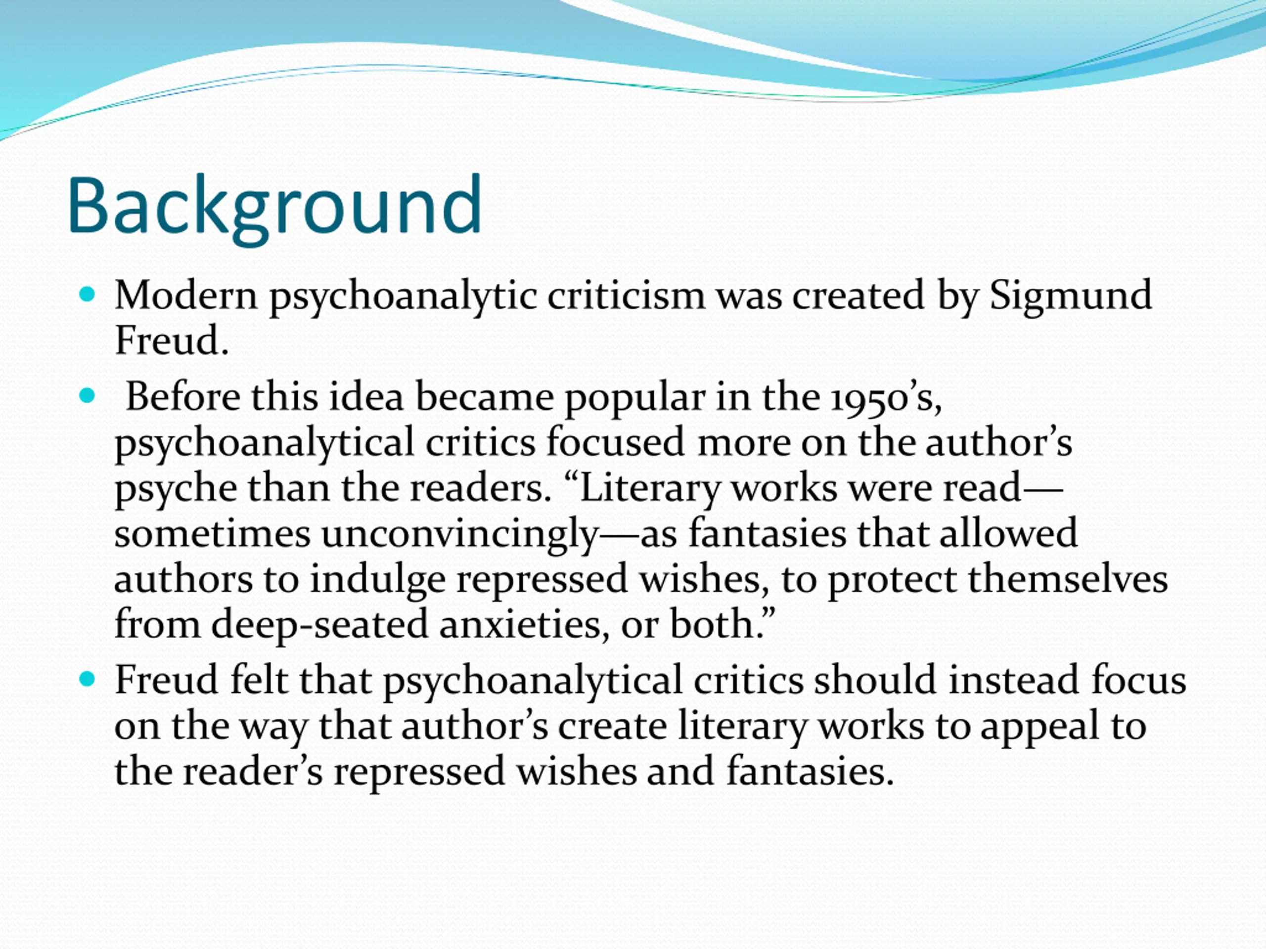 Background Modern psychoanalytic criticism was created by Sigmund Freud. Before this idea became popular in the 1950 s, psychoanalytical critics focused more on the author s psyche than the readers. Literary works were read sometimes unconvincingly as fantasies that allowed authors to indulge repressed wishes, to protect themselves from deep-seated anxieties, or both. Freud felt that psychoanalytical critics should instead focus on the way that author s create literary works to appeal to the reader s repressed wishes and fantasies.