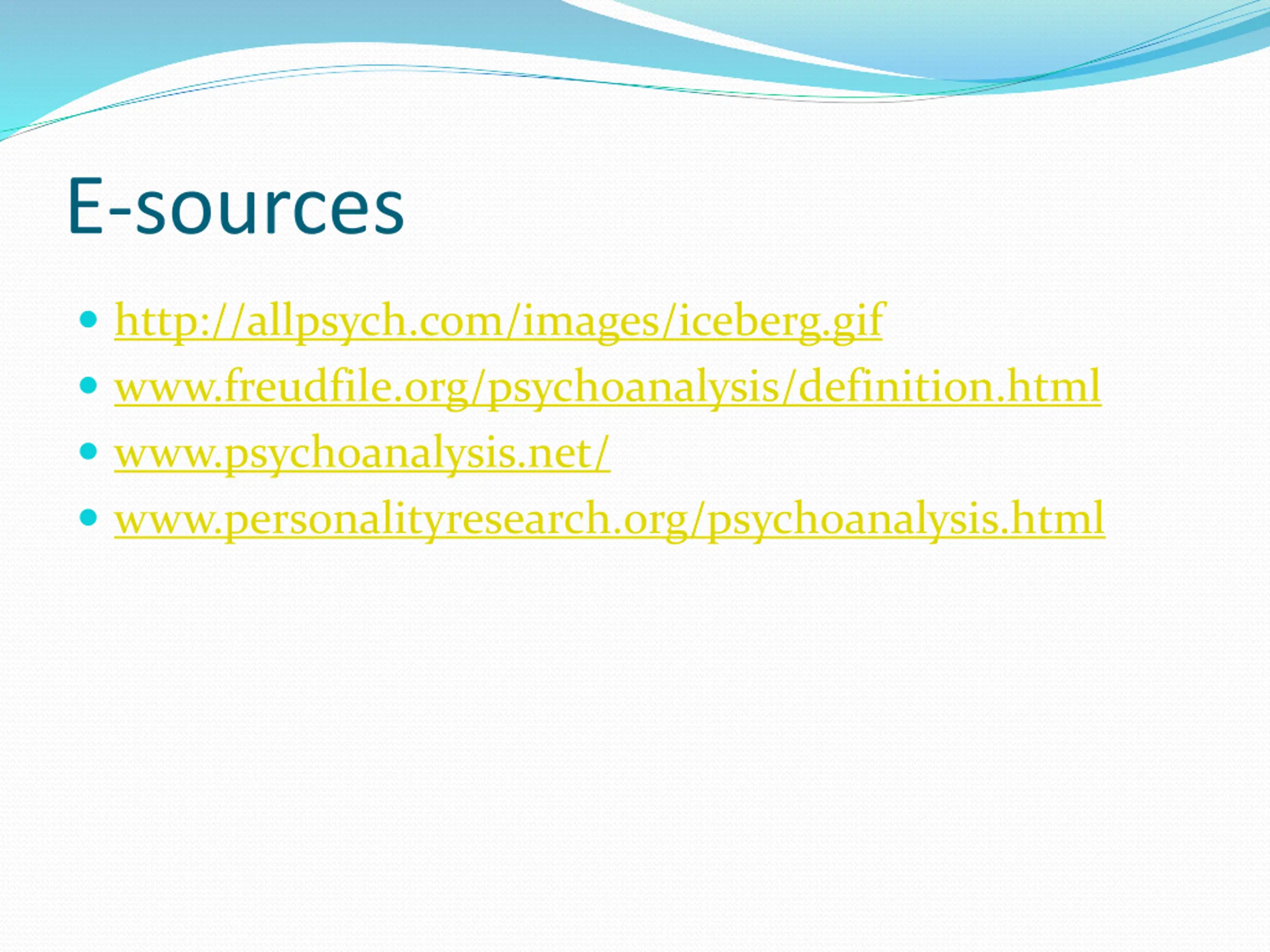 E-sources http://allpsych.com/images/iceberg.gif www.freudfile.org/psychoanalysis/definition.html www.psychoanalysis.net/ www.personalityresearch.org/psychoanalysis.html