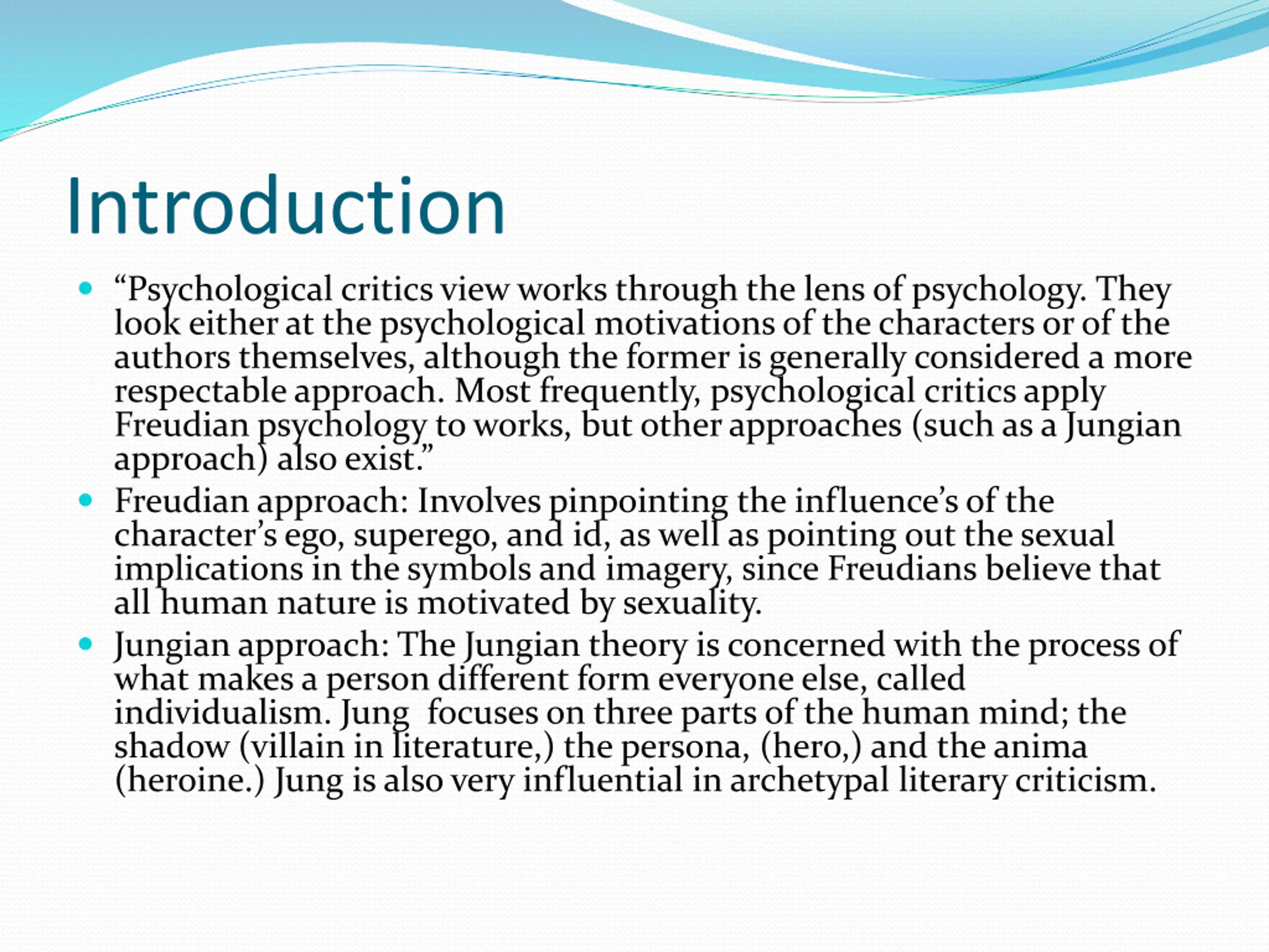 Introduction Psychological critics view works through the lens of psychology. They look either at the psychological motivations of the characters or of the authors themselves, although the former is generally considered a more respectable approach. Most frequently, psychological critics apply Freudian psychology to works, but other approaches (such as a Jungian approach) also exist. Freudian approach: Involves pinpointing the influence s of the character s ego, superego, and id, as well as pointing out the sexual implications in the symbols and imagery, since Freudians believe that all human nature is motivated by sexuality. Jungian approach: The Jungian theory is concerned with the process of what makes a person different form everyone else, called individualism. Jung focuses on three parts of the human mind; the shadow (villain in literature,) the persona, (hero,) and the anima (heroine.) Jung is also very influential in archetypal literary criticism.
