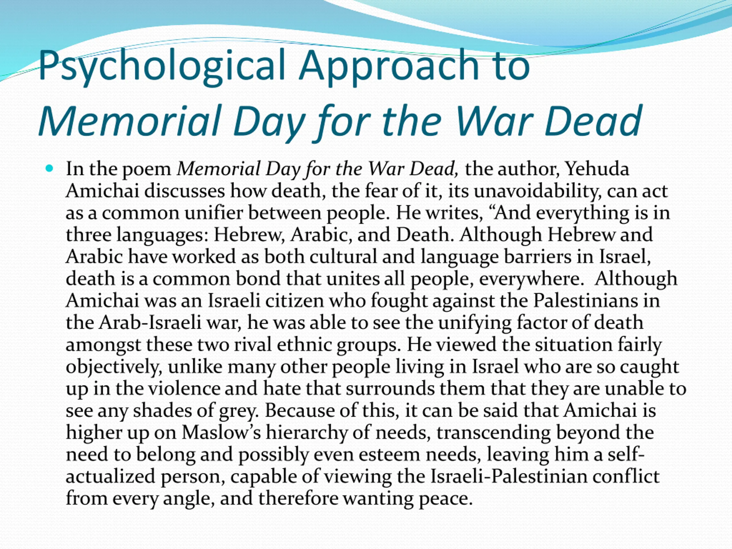 Psychological Approach to Memorial Day for the War Dead In the poem Memorial Day for the War Dead, the author, Yehuda Amichai discusses how death, the fear of it, its unavoidability, can act as a common unifier between people. He writes, And everything is in three languages: Hebrew, Arabic, and Death. Although Hebrew and Arabic have worked as both cultural and language barriers in Israel, death is a common bond that unites all people, everywhere. Although Amichai was an Israeli citizen who fought against the Palestinians in the Arab-Israeli war, he was able to see the unifying factor of death amongst these two rival ethnic groups. He viewed the situation fairly objectively, unlike many other people living in Israel who are so caught up in the violence and hate that surrounds them that they are unable to see any shades of grey. Because of this, it can be said that Amichai is higher up on Maslow s hierarchy of needs, transcending beyond the need to belong and possibly even esteem needs, leaving him a self- actualized person, capable of viewing the Israeli-Palestinian conflict from every angle, and therefore wanting peace.