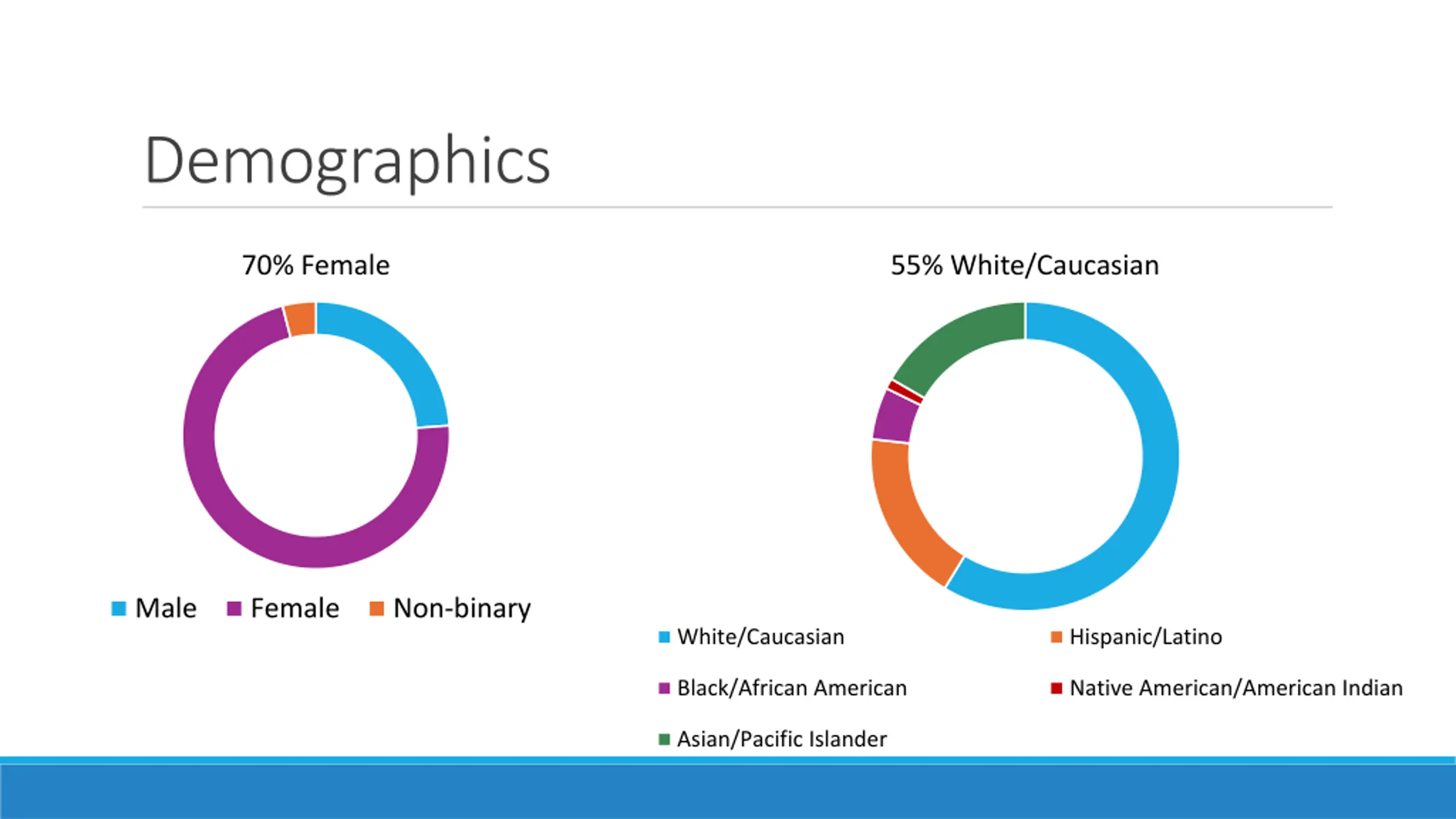 Demographics 70% Female 55% White/Caucasian Male Female Non-binary White/Caucasian Hispanic/Latino Black/African American Native American/American Indian Asian/Pacific Islander