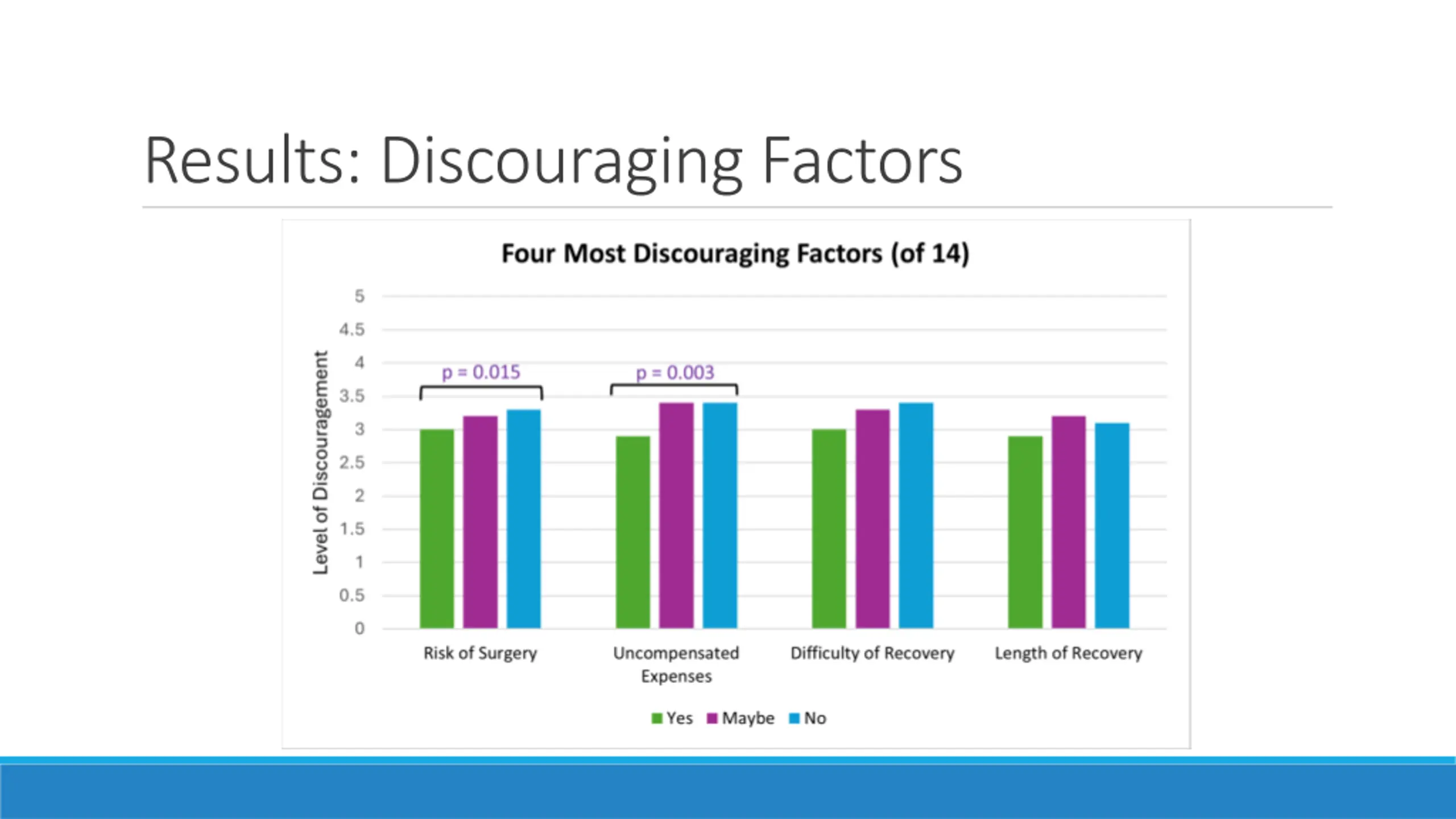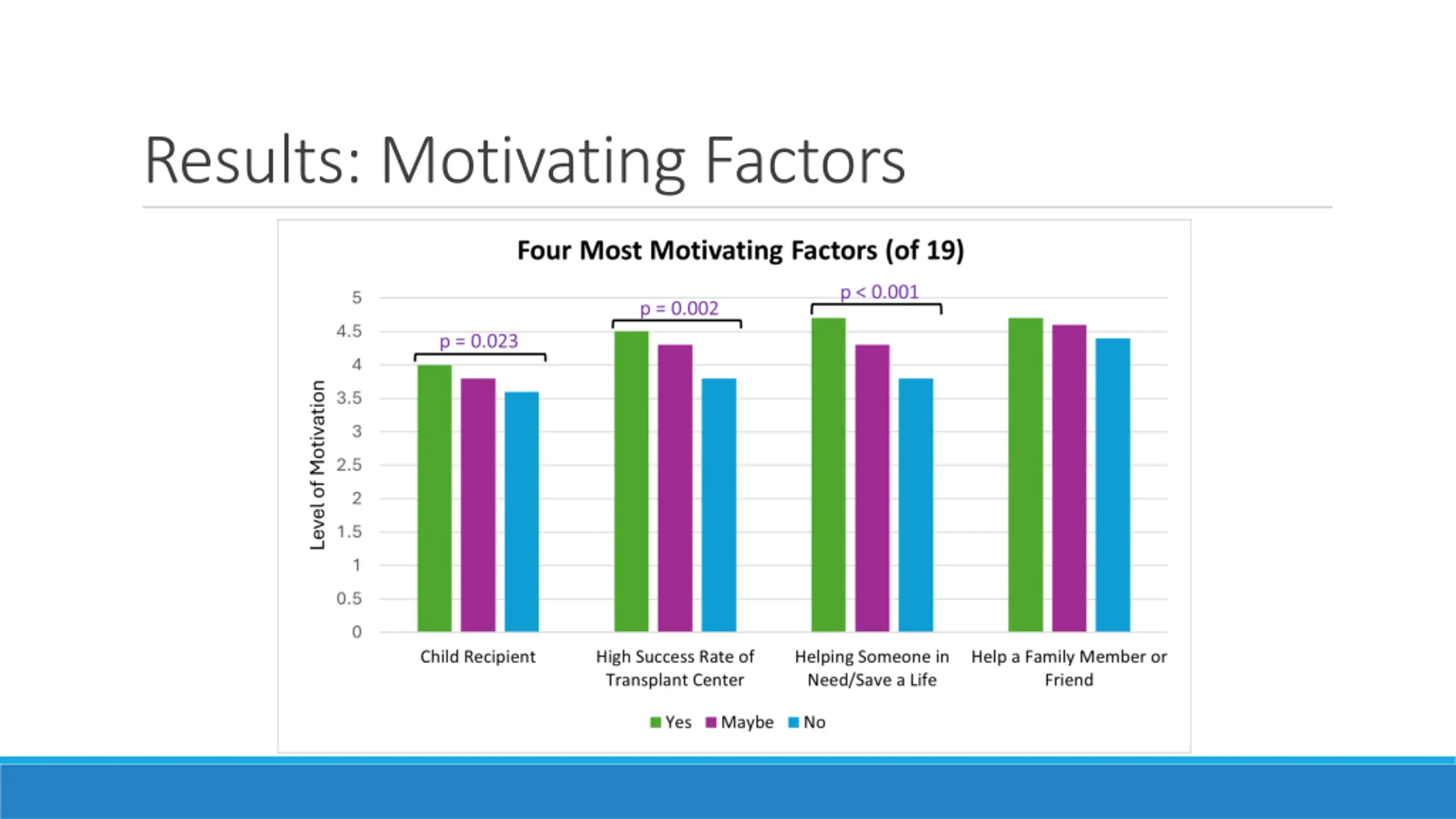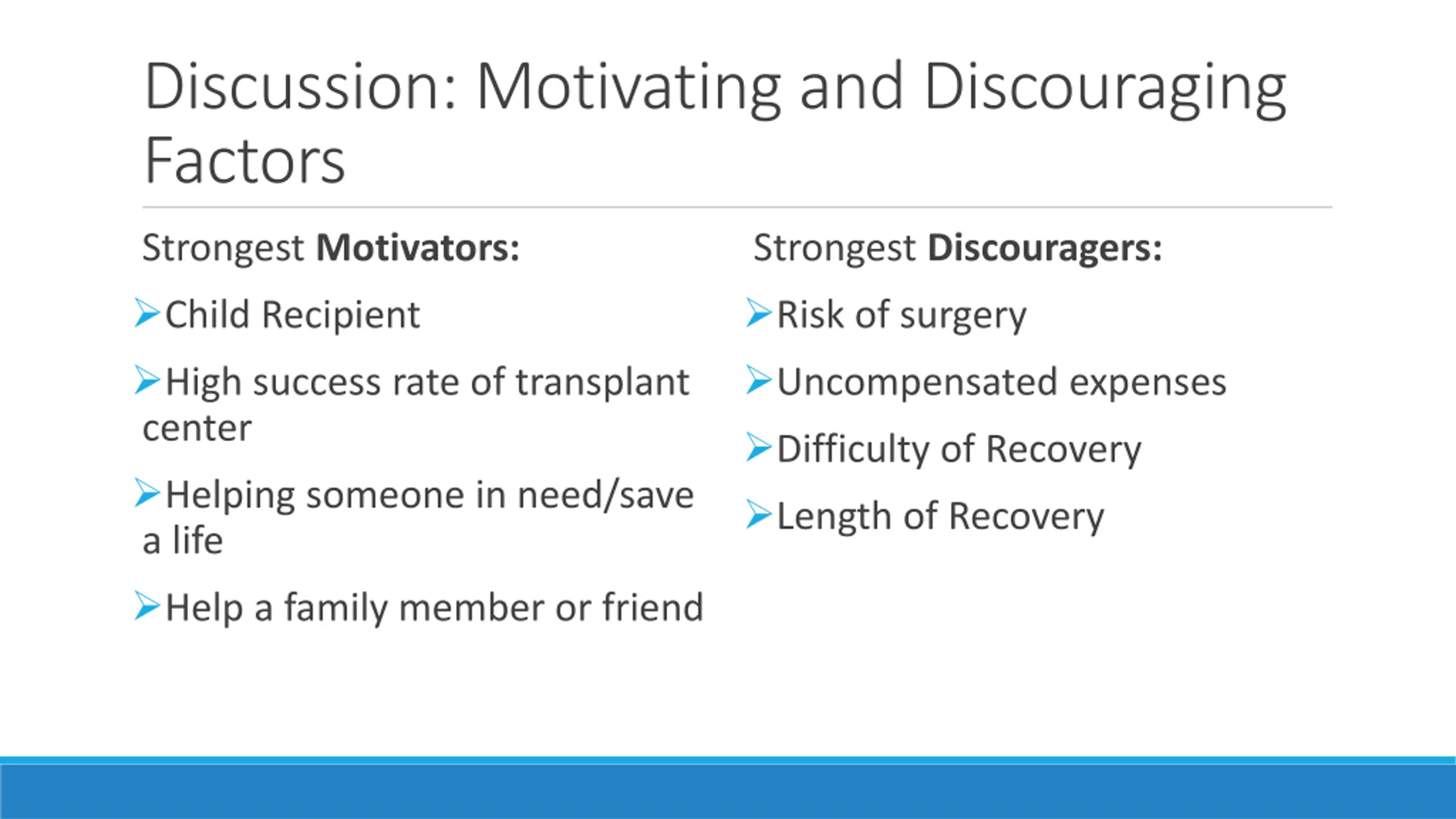 Discussion: Motivating and Discouraging Factors Strongest Motivators: Child Recipient High success rate of transplant center Helping someone in need/save a life Help a family member or friend Strongest Discouragers: Risk of surgery Uncompensated expenses Difficulty of Recovery Length of Recovery