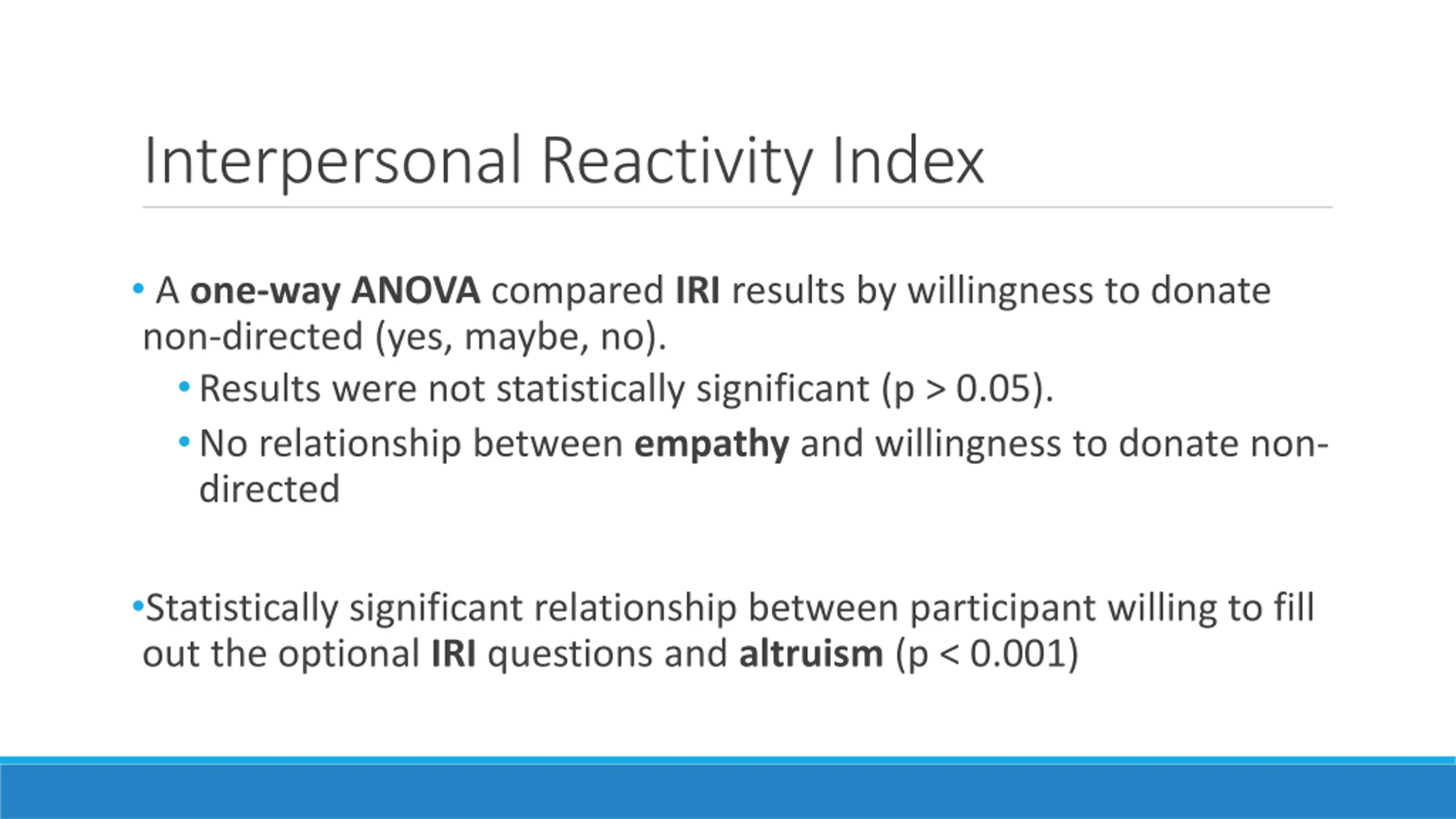 Interpersonal Reactivity Index A one-way ANOVA compared IRI results by willingness to donate non-directed (yes, maybe, no). Results were not statistically significant (p > 0.05). No relationship between empathy and willingness to donate non- directed Statistically significant relationship between participant willing to fill out the optional IRI questions and altruism (p < 0.001)