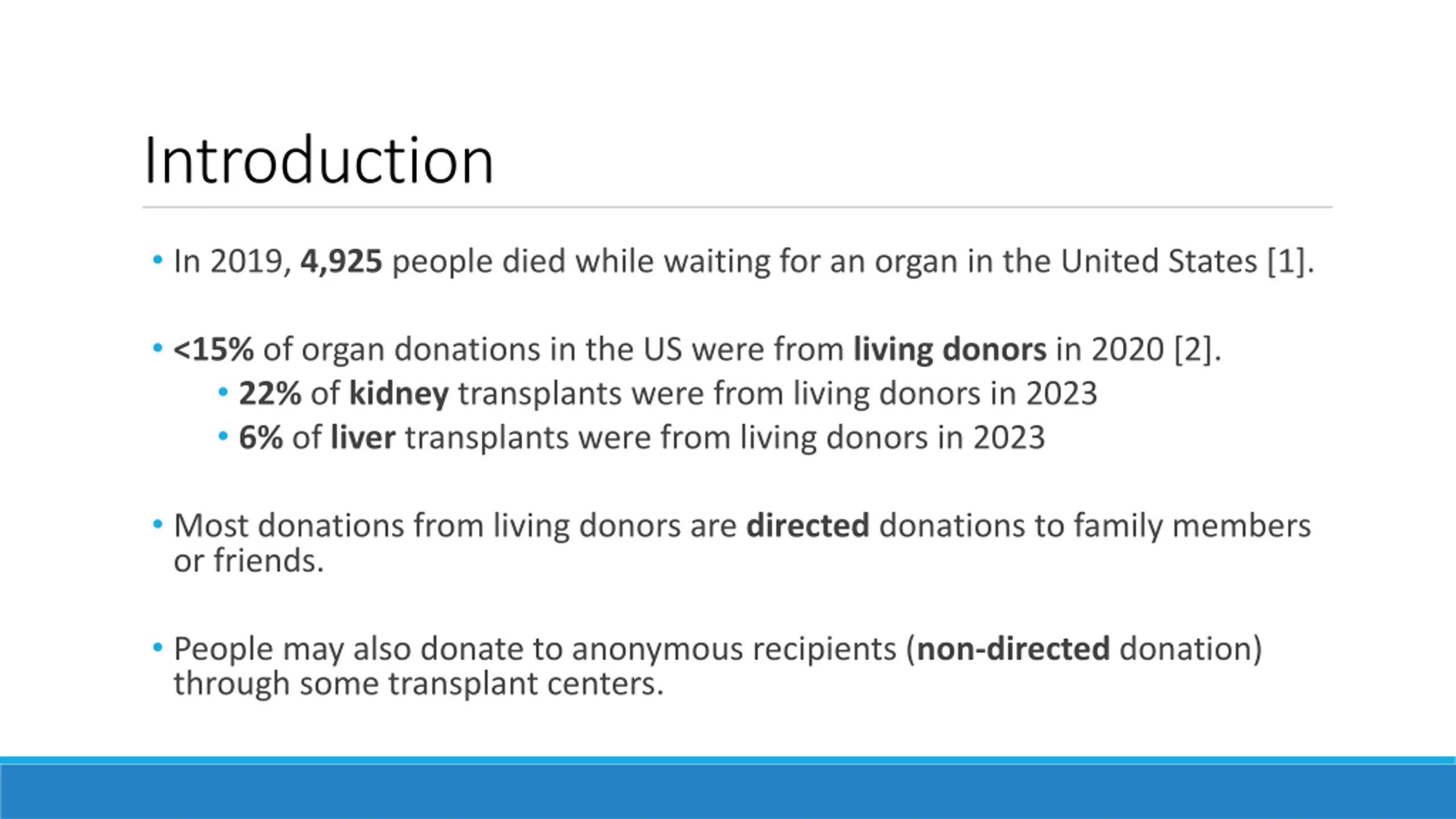Introduction In 2019, 4,925 people died while waiting for an organ in the United States [1]. <15% of organ donations in the US were from living donors in 2020 [2]. 22% of kidney transplants were from living donors in 2023 6% of liver transplants were from living donors in 2023 Most donations from living donors are directed donations to family members or friends. People may also donate to anonymous recipients (non-directed donation) through some transplant centers.